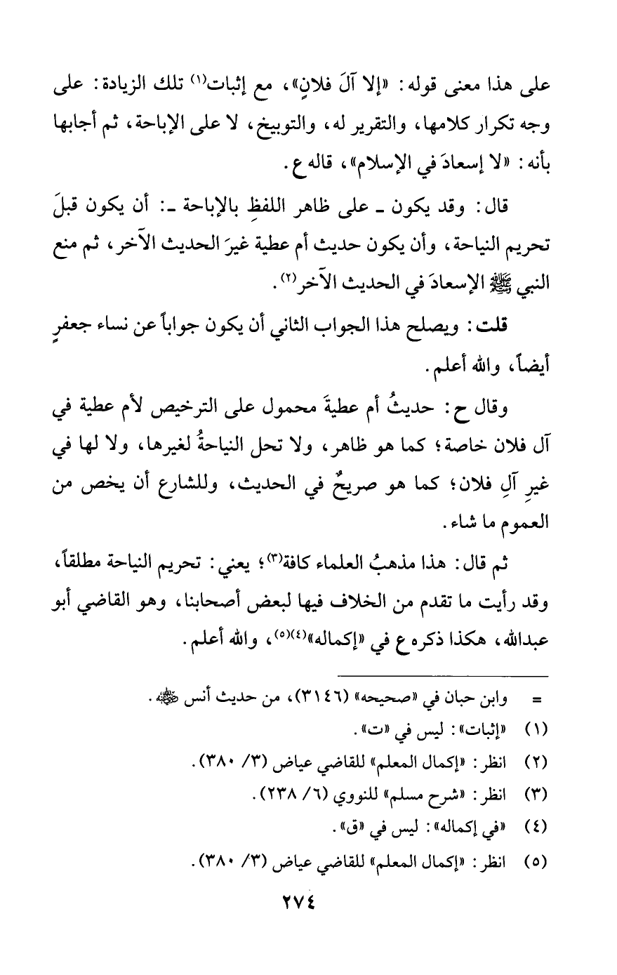 ثم قال: هذا مذهبُ العلماء كافة (¬3)؛ يعني: تحريم النياحة مطلقًا، وقد رأيت ما تقدم من الخلاف فيها لبعض أصحابنا، وهو القاضي أبو عبد اللَّه، هكذا ذكره ع في "إكماله" (¬4) (¬5)، واللَّه أعلم.