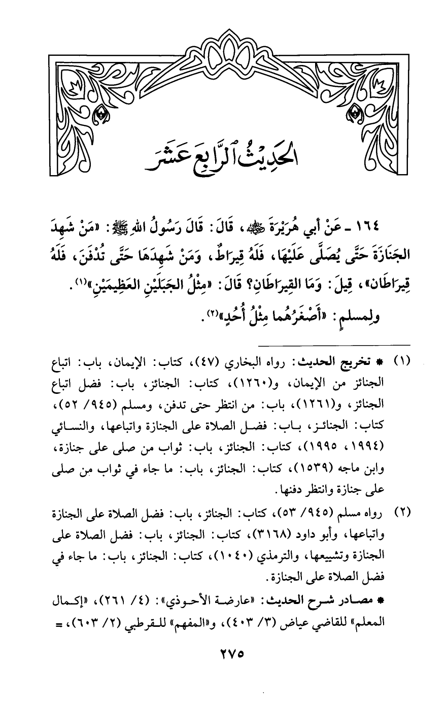 164 - عَنْ أبي هُرَيْرَةَ -رضي اللَّه عنه-، قَالَ: قَالَ رَسُولُ اللَّهِ -صلى اللَّه عليه وسلم-: "مَنْ شَهِدَ الجَنَازَةَ حَتَّى يُصَلَّى عَلَيْهَا، فَلَهُ قِيرَاطٌ، وَمَنْ شَهِدَهَا حَتَّى تُدْفَنَ، فَلَهُ قِيرَاطَان"، قِيلَ: وَمَا القِيرَاطَانِ؟ قَالَ: "مِثْلُ الجَبَلَيْنِ العَظِيمَيْنِ" (¬1).
