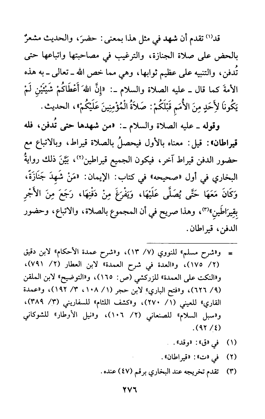 وقوله -عليه الصلاة والسلام-: "من شهدها حتى تُدفن، فله قيراطان": قيل: معناه بالأول فيحصلُ بالصلاة قيراط، وبالاتباع مع حضور الدفن قيراط آخر، فيكون الجميع قيراطين (¬2)، بيَّنَ ذلك روايةُ البخاري في أول "صحيحه" في كتاب: الإيمان: "مَنْ شَهِدَ جَنَازَةً، وَكَانَ مَعَهَا حَتَّى يُصَلَّى عَلَيْهَا، وَيَفْرَغَ مِنْ دَفْنِهَا، رَجَعَ مِنَ الأَجْرِ بِقِيرَاطَينِ" (¬3)، وهذا صريح في أن المجموع بالصلاة، والاتباع، وحضور الدفن، قيراطان.