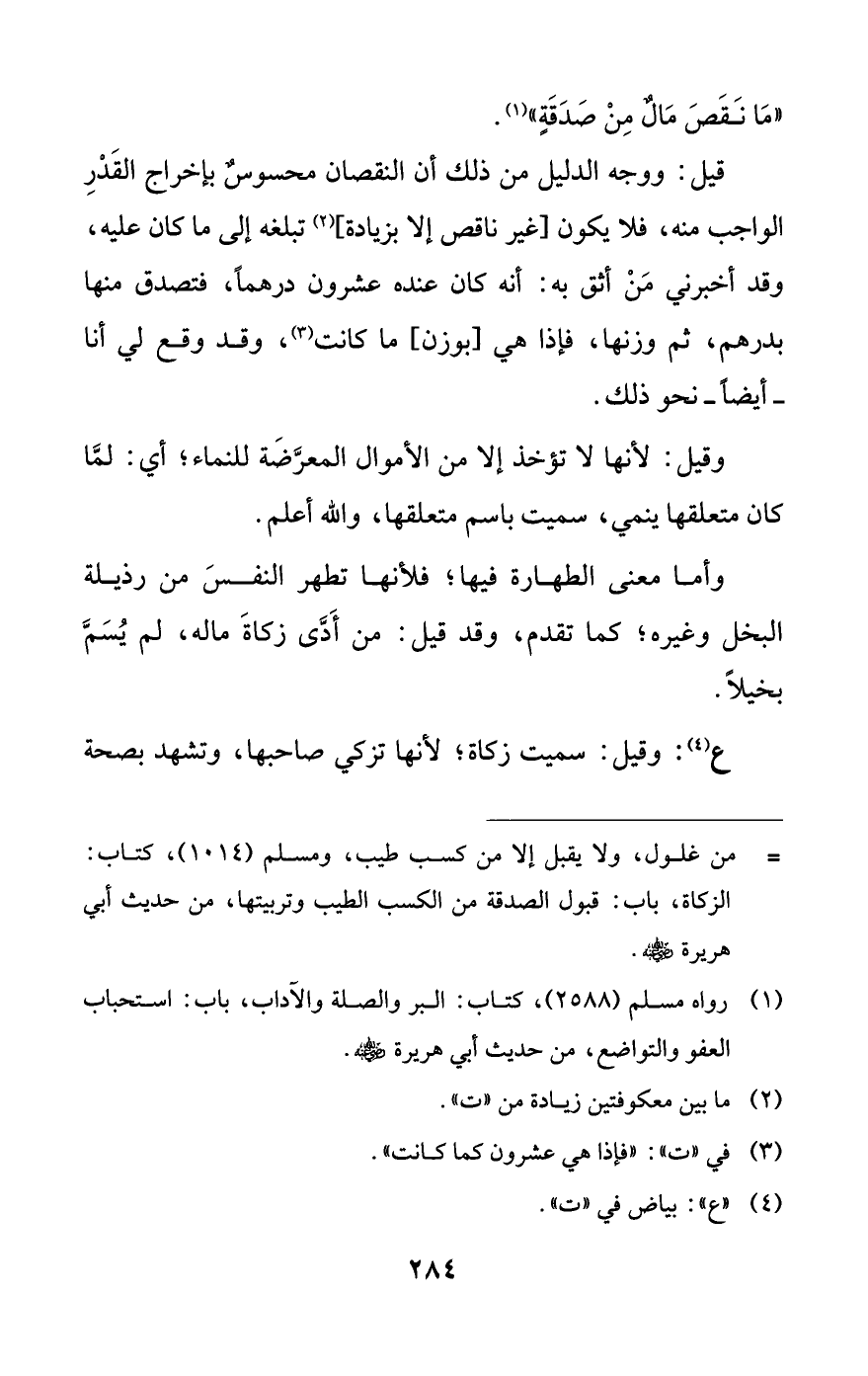 قيل: ووجه الدليل من ذلك أن النقصان محسوسٌ بإخراج القَدْرِ الواجب منه، فلا يكون [غير ناقص إلا بزيادة] (¬2) تبلغه إلى ما كان عليه، وقد أخبرني مَنْ أثق به: أنه كان عنده عشرون درهمًا، فتصدق منها بدرهم، ثم وزنها، فإذا هي [بوزن] ما كانت (¬3)، وقد وقع لي أنا -أيضًا- نحو ذلك.