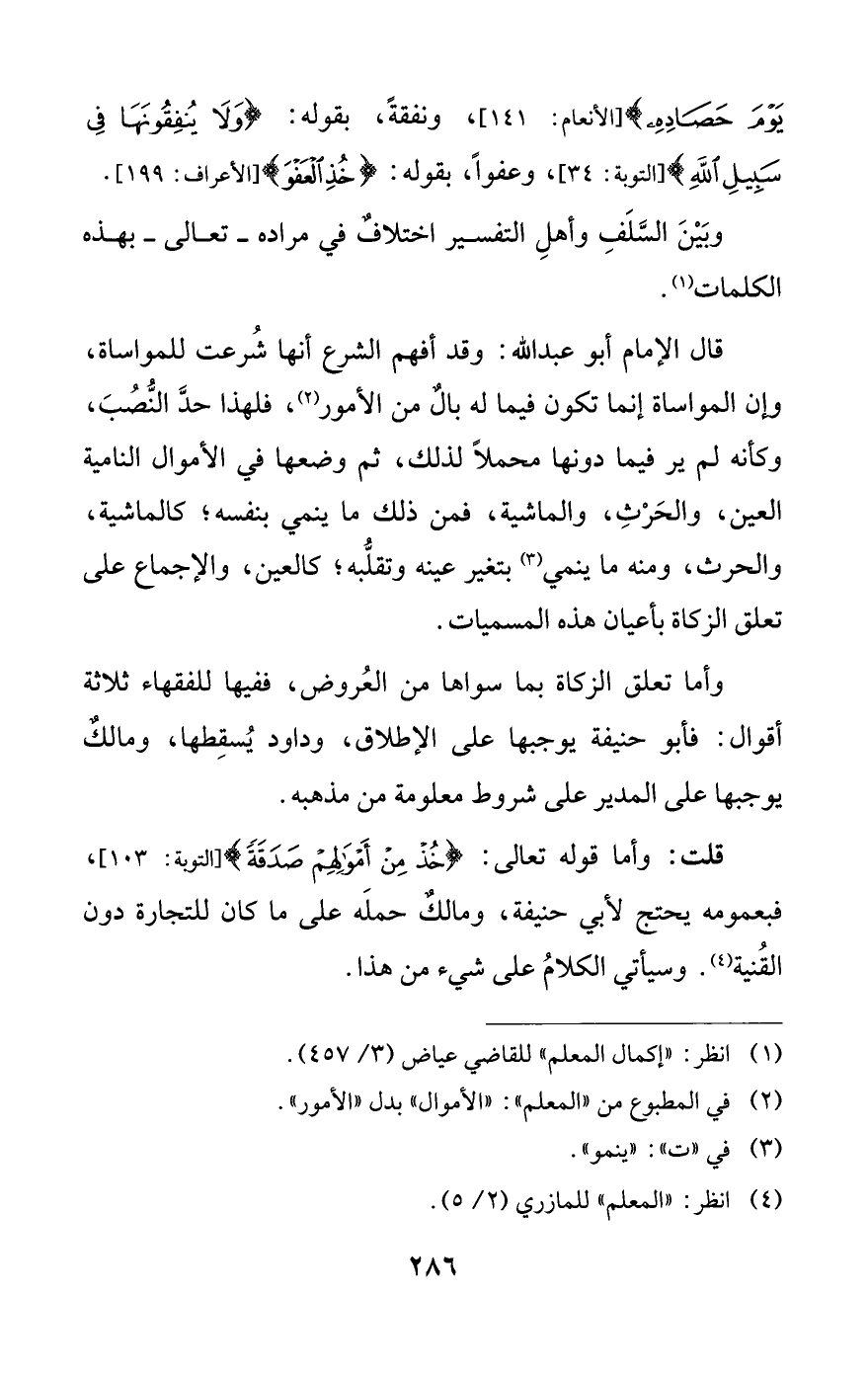 قال الإِمام أبو عبد اللَّه: وقد أفهم الشرع أنها شُرعت للمواساة، وإن المواساة إنما تكون فيما له بالٌ من الأمور (¬2)، فلهذا حدَّ النُّصُبَ، وكأنه لم ير فيما دونها محملًا لذلك، ثم وضعها في الأموال النامية العين، والحَرْثِ، والماشية، فمن ذلك ما ينمي بنفسه، كالماشية، والحرث، ومنه ما ينمي (¬3) بتغير عينه وتقلُّبه، كالعين، والإجماع على تعلق الزكاة بأعيان هذه المسميات.