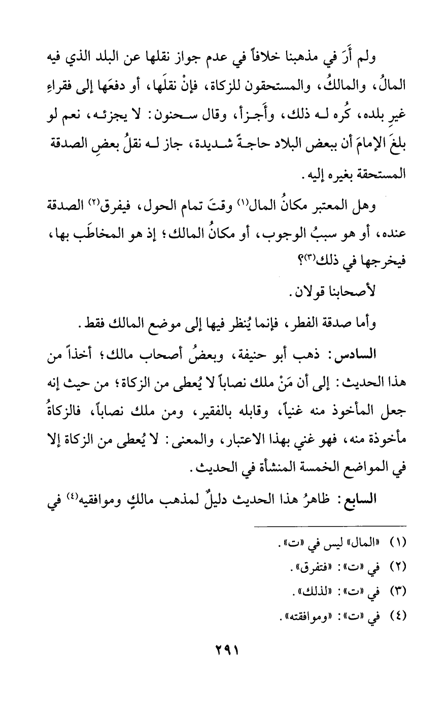 ولم أَرَ في مذهبنا خلافًا في عدم جواز نقلها عن البلد الذي فيه المالُ، والمالكُ، والمستحقون للزكاة، فإنْ نقلَها، أو دفعَها إلى فقراءِ غيرِ بلده، كُره له ذلك، وأَجزأ، وقال سحنون: لا يجزئه، نعم لو بلغَ الإمامَ أن ببعض البلاد حاجةً شديدة، جاز له نقلُ بعضِ الصدقة المستحقة بغيره إليه.