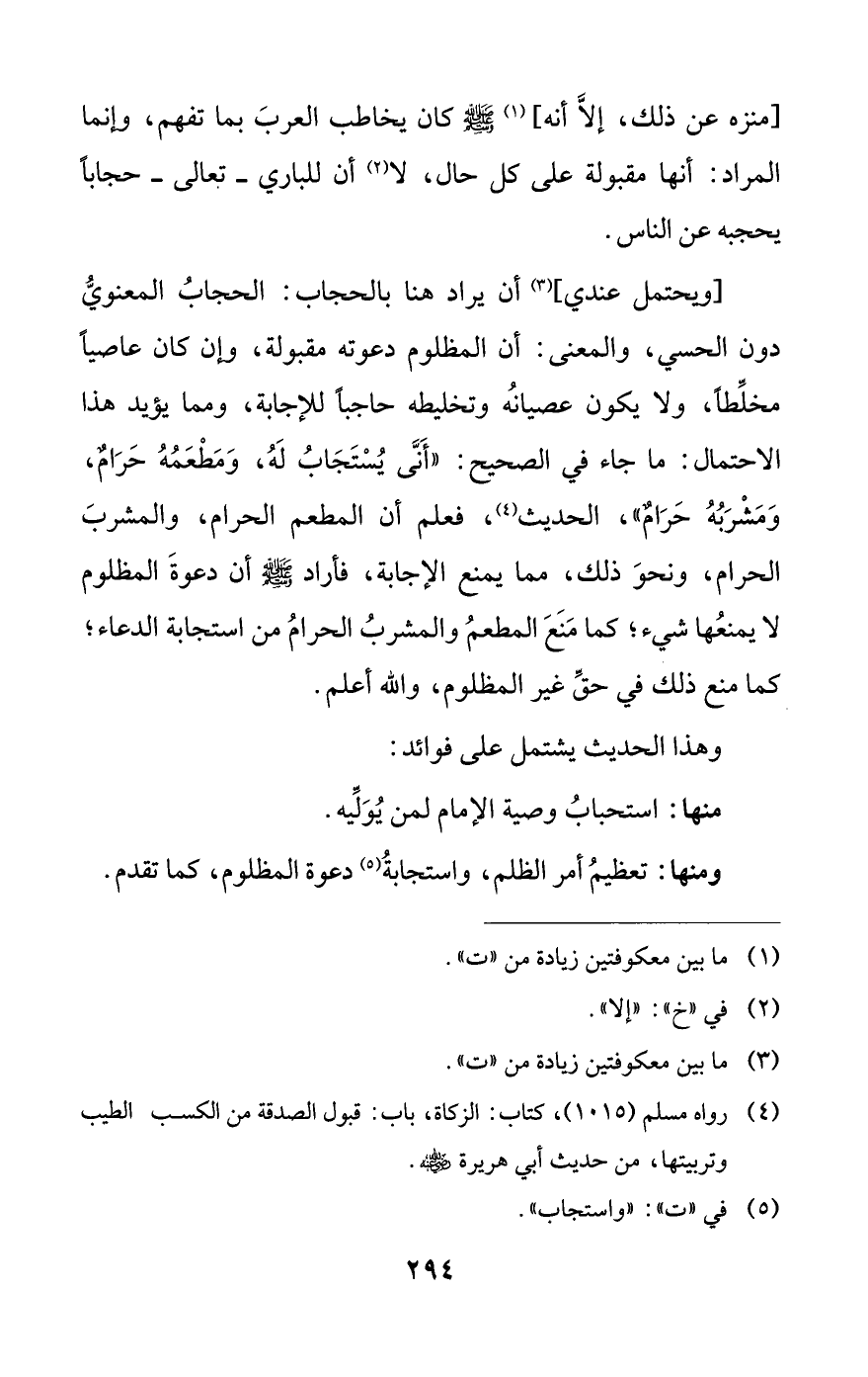 [ويحتمل عندي] (¬3) أن يراد هنا بالحجاب: الحجابُ المعنويُّ دون الحسي، والمعنى: أن المظلوم دعوته مقبولة، وإن كان عاصيًا مخلِّطًا، ولا يكون عصيانُه وتخليطه حاجبًا للإجابة، ومما يؤيد هذا الاحتمال: ما جاء في الصحيح: "أَنَّى يُسْتَجَابُ لَهُ، وَمَطْعَمُهُ حَرَامٌ، وَمَشْرَبُهُ حَرَامٌ"، الحديث (¬4)، فعلم أن المطعم الحرام، والمشربَ الحرام، ونحوَ ذلك، مما يمنع الإجابة، فأراد -صلى اللَّه عليه وسلم- أن دعوةَ المظلوم لا يمنعُها شيء؛ كما مَنَعَ المطعمُ والمشربُ الحرامُ من استجابة الدعاء؛ كما منع ذلك في حقِّ غير المظلوم، واللَّه أعلم.