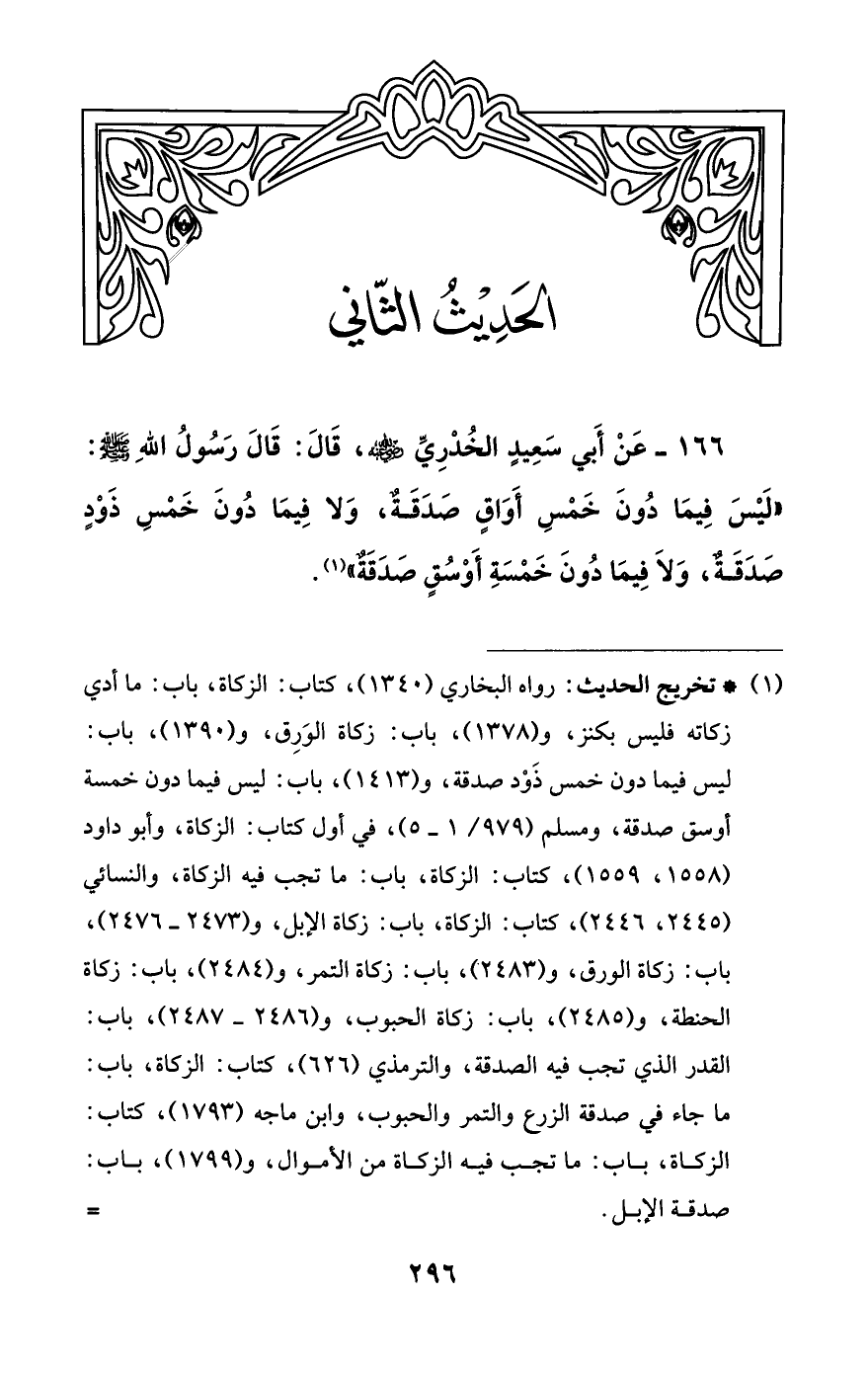 166 - عَنْ أَبي سعيد الخُدْرِيِّ -رضي اللَّه عنه-، قَالَ: قَالَ رَسُولُ اللَّهِ -صلى اللَّه عليه وسلم-: "لَيْسَ فِيمَا دُونَ خَمْسِ أَوَاقٍ صَدَقَةٌ، وَلا فِيمَا دُونَ خَمْسِ ذَوْدٍ صَدَقَةٌ، وَلا فِيمَا دُونَ خَمْسَةِ أَوْسُقٍ صَدَقَةٌ" (¬1).
