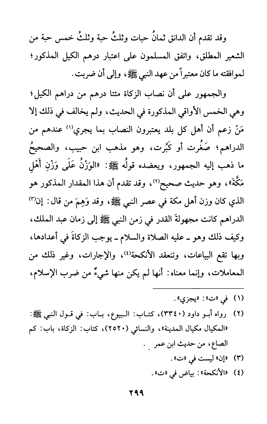 وقد تقدم أن الدانق ثمانُ حبات وثلثُ حبة وثلثُ خمس حبة من الشعير المطلق، واتفق المسلمون على اعتبار درهم الكيل المذكور؛ لموافقته ما كان معتبرًا من عهد النبي -صلى اللَّه عليه وسلم-، وإلى أن ضربت.