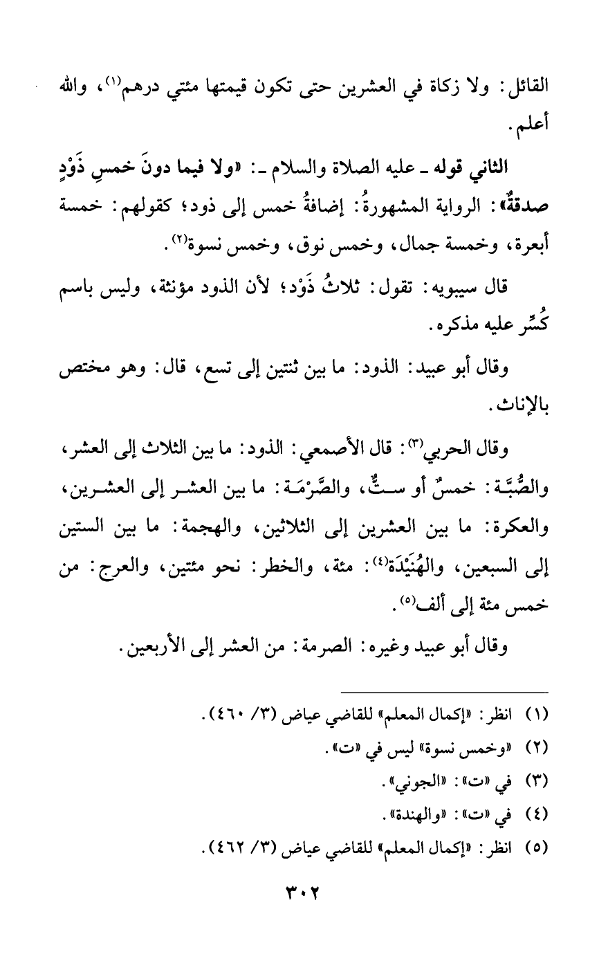 الثاني قوله -عليه الصلاة والسلام-: "ولا فيما دونَ خمسِ ذَوْدٍ صدقةٌ": الرواية المشهورةُ: إضافةُ خمس إلى ذود، كقولهم: خمسة أبعرة، وخمسة جمال، وخمس نوق، وخمس نسوة (¬2).