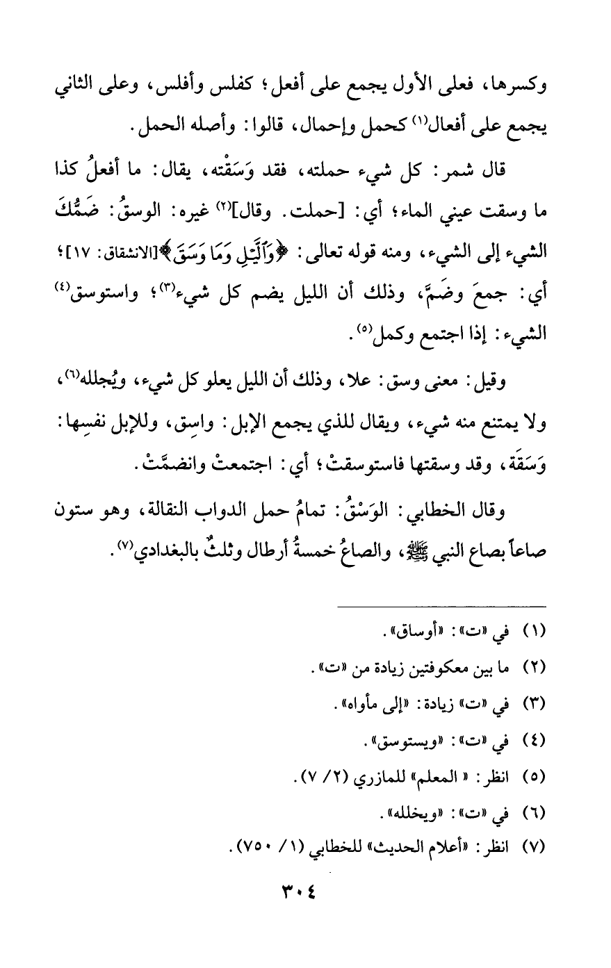 قال شمر: كل شيء حملته، فقد وَسَقْته، يقال: ما أفعلُ كذا ما وسقت عيني الماء، أي: [حملت. وقال] (¬2) غيره: الوسقُ: ضَمُّكَ الشيء إلى الشيء، ومنه قوله تعالى: {وَاللَّيْلِ وَمَا وَسَقَ} [الانشقاق: 17]؛ أي: جمعَ وضَمَّ، وذلك أن الليل يضم كل شيء (¬3)؛ واستوسق (¬4) الشيء: إذا اجتمع وكمل (¬5).