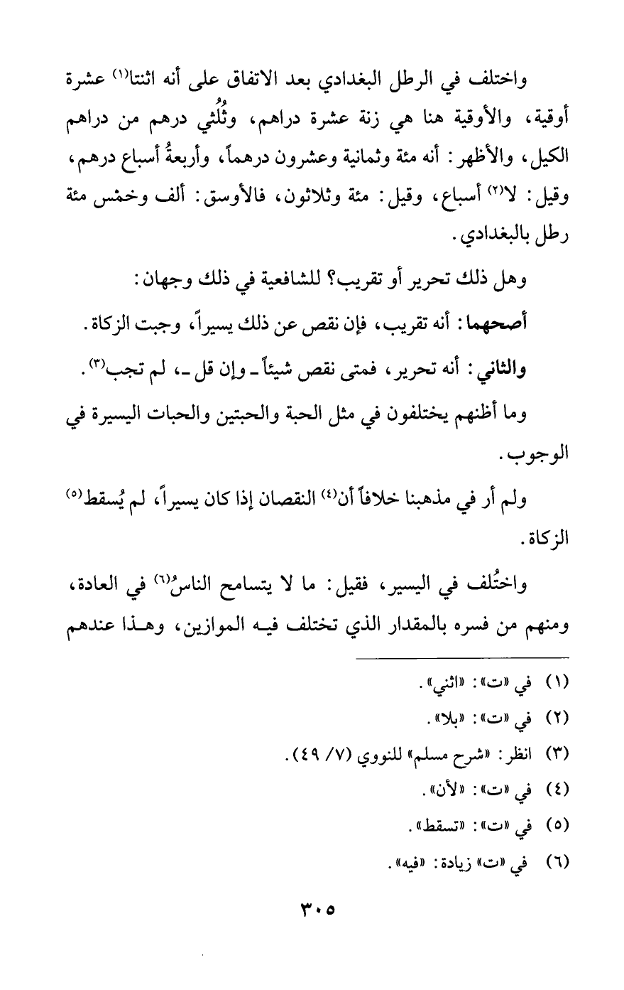 واختلف في الرطل البغدادي بعد الاتفاق على أنه اثنتا (¬1) عشرة أوقية، والأوقية هنا هي زنة عشرة دراهم، وثُلُثي درهم من دراهم الكيل، والأظهر: أنه مئة وثمانية وعشرون درهمًا، وأبيبعةُ أسباع درهم، وقيل: لا (¬2) أسباع، وقيل: مئة وثلاثون، فالأوسق: ألف وخمْس مئة رطل بالبغدادي.