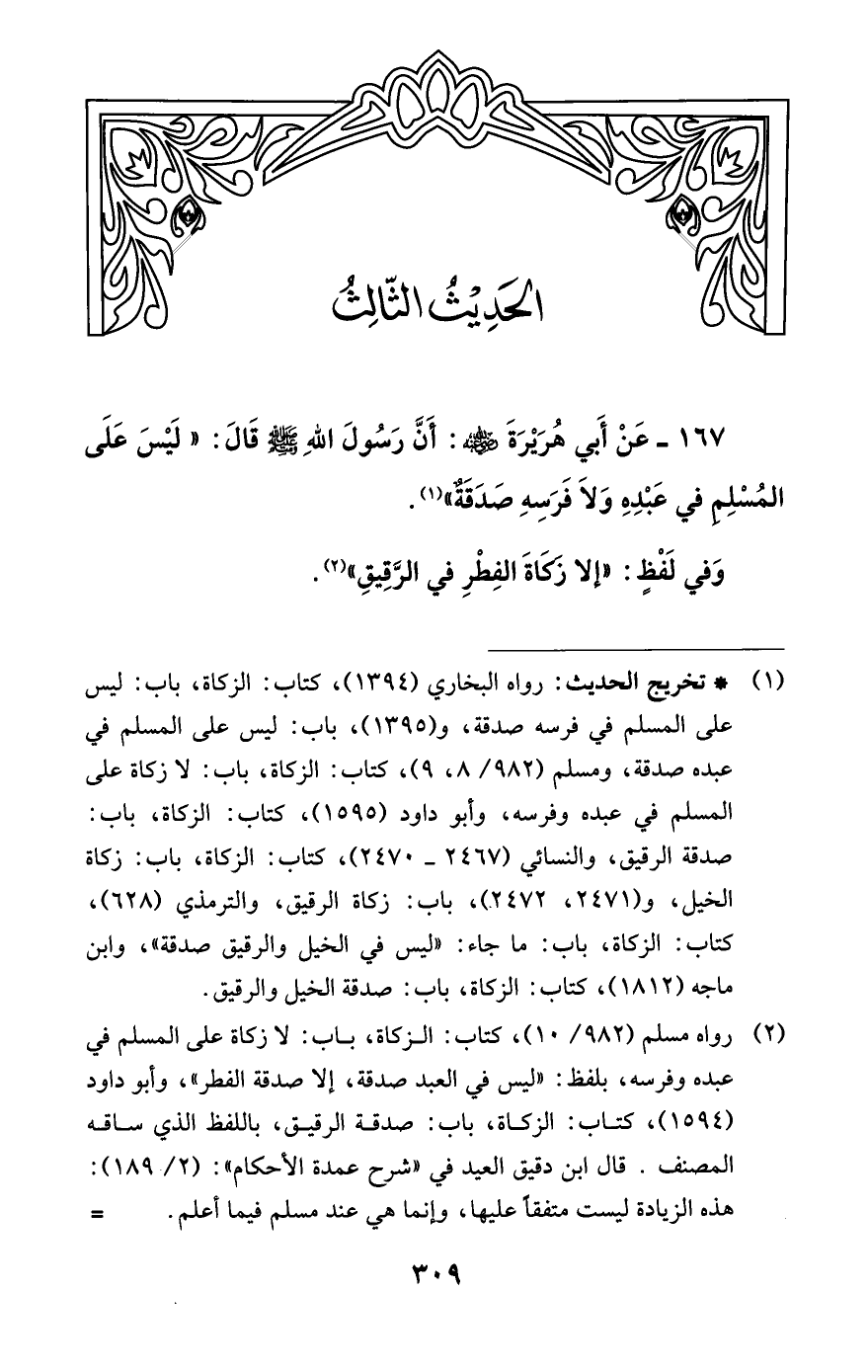 167 - عَنْ أَبي هُرَيْرَةَ -رضي اللَّه عنه-: أَنَّ رَسُولَ اللَّه -صلى اللَّه عليه وسلم- قَالَ: "لَيْسَ عَلَى المُسْلِمِ في عَبْدِهِ وَلَا فَرَسِهِ صَدَقَةٌ" (¬1).