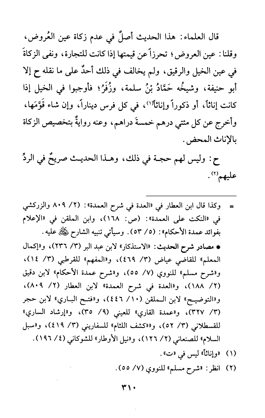 قال العلماء: هذا الحديث أصلٌ في عدم زكاة عين العُروض، وقلنا: عين العروض، تحرزًا عن قيمتها إذا كانت للتجارة، ونفى الزكاةَ في عين الخيل والرقيق، ولم يخالف في ذلك أحدٌ على ما نقله ح إلا أبو حنيفة، وشيخُه حَمَّادُ بْنُ سلمة، وزُفَرُ، فأوجبوا في الخيل إذا كانت إناثًا، أو ذكورًا وإناثًا (¬1)، في كل فرس دينارًا، وإن شاء قَوَّمَها، وأخرج عن كل مئتي درهم خمسةَ دراهم، وعنه روايةٌ بتخصيص الزكاة بالإناث المحض.