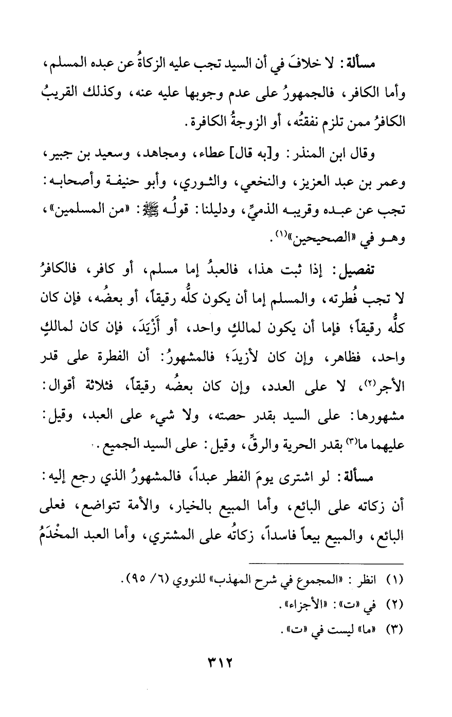 مسألة: لا خلافَ في أن السيد تجب عليه الزكاةُ عن عبده المسلم، وأما الكافر، فالجمهورُ على عدم وجوبها عليه عنه، وكذلك القريبُ الكافرُ ممن تلزم نفقتُه، أو الزوجةُ الكافرة.