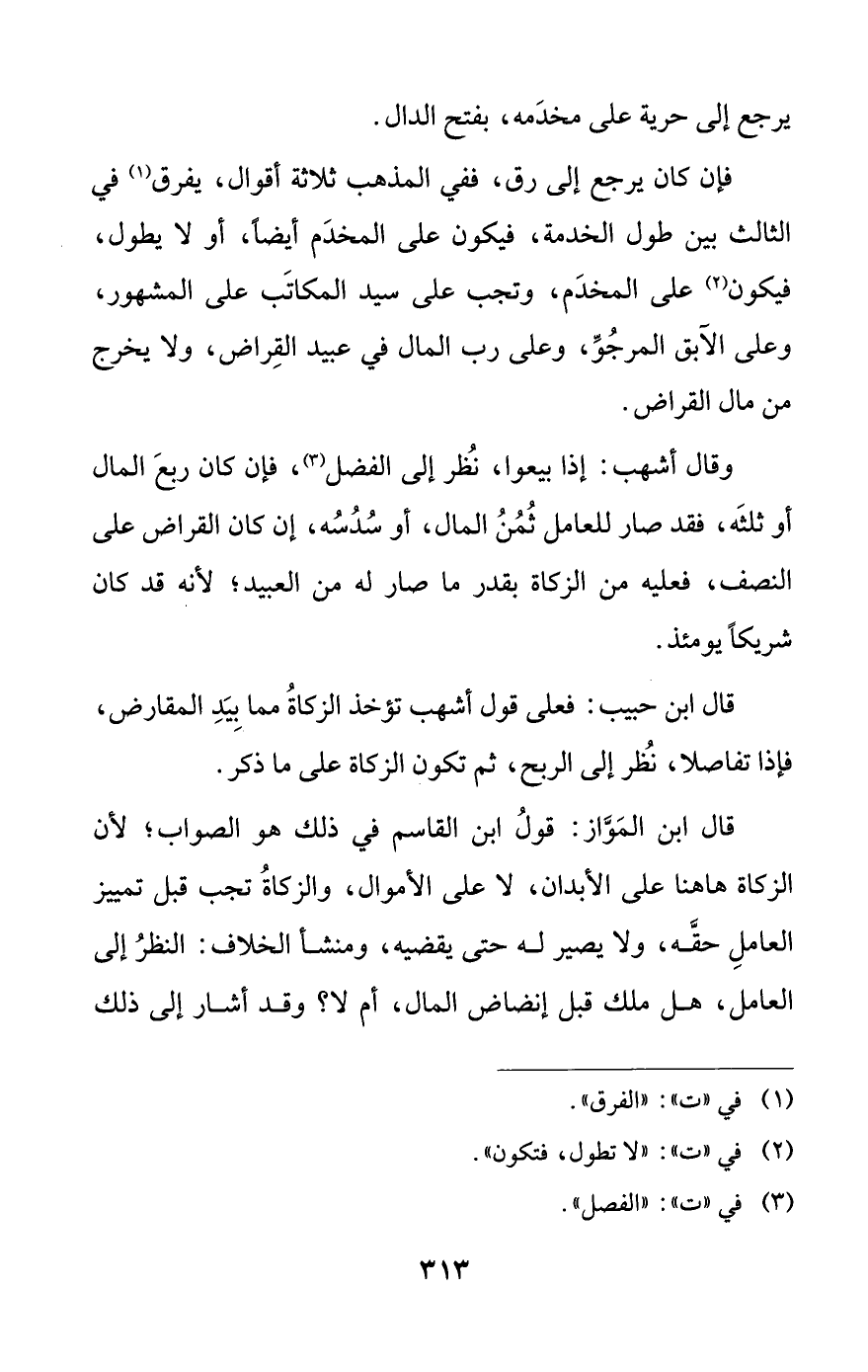 وقال أشهب: إذا بيعوا، نُظر إلى الفضل (¬3)، فإن كان ربعَ المال أو ثلثَه، فقد صار للعامل ثُمُنُ المال، أو سُدُسُه، إن كان القراض على النصف، فعليه من الزكاة بقدر ما صار له من العبيد؛ لأنه قد كان شريكًا يومئذ.