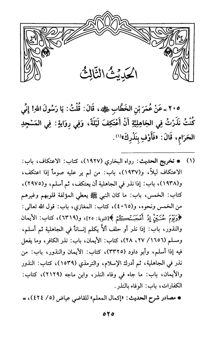 205 - عَنْ عُمَرَ بْنِ الخَطَّابِ -رضي اللَّه عنه-، قَالَ: قُلْتُ: يَا رَسُولَ اللَّهِ! إِنِّي كُنْتُ نَذَرْتُ فِي الجَاهِلِيّهِ أَنْ أَعْتكِفَ لَيْلَةً، وَفِي رِوَايةٍ: فِي المَسْجدِ الحَرَامِ، قَالَ: "فَأَوْفِ بِنَذْرِكَ" (¬1).
