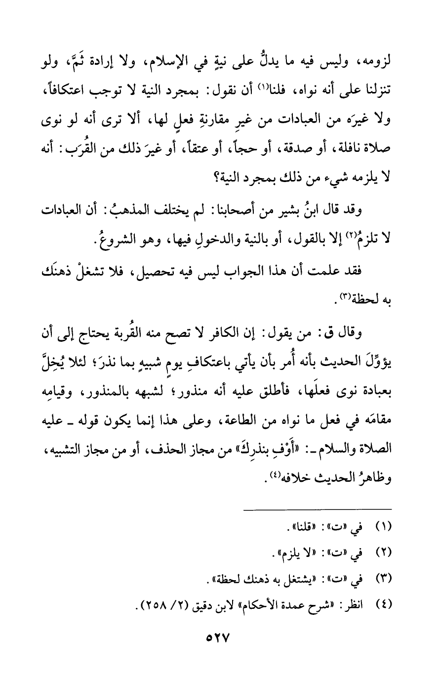 لزومه، وليس فيه ما يدلُّ على نيةٍ في الإسلام، ولا إرادة ثَمَّ، ولو تنزلنا على أنه نواه، فلنا (¬1) أن نقول: بمجرد النية لا توجب اعتكافًا، ولا غيرَه من العبادات من غيرِ مقارنةِ فعلٍ لها، ألا ترى أنه لو نوى صلاة نافلة، أو صدقة، أو حجًا، أو عتقًا، أو غيرَ ذلك من القُرَب: أنه لا يلزمه شيء من ذلك بمجرد النية؟