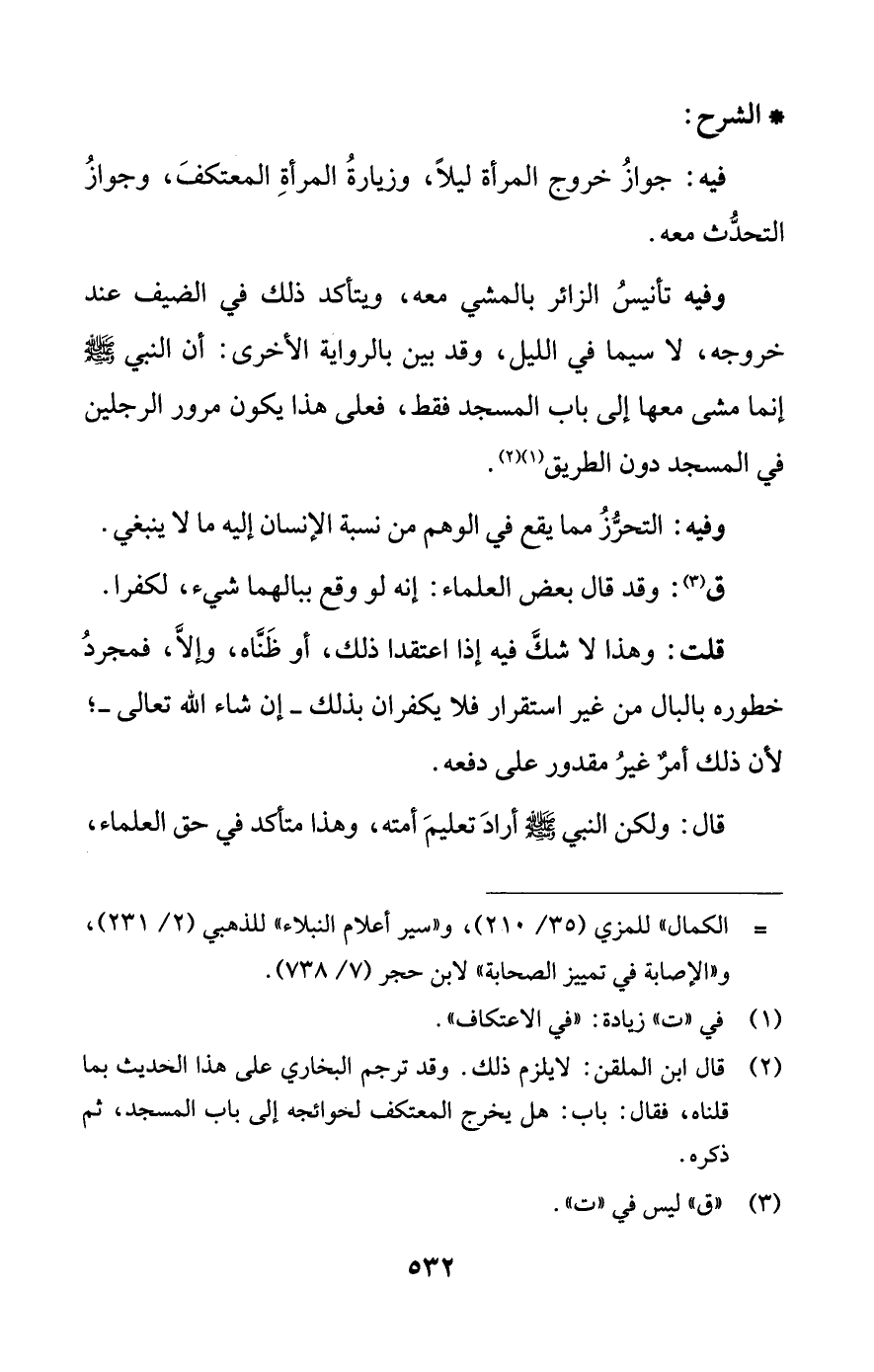 وفيه تأنيسُ الزائر بالمشي معه، ويتأكد ذلك في الضيف عند خروجه، لا سيما في الليل، وقد بين بالرواية الأخرى: أن النبي -صلى اللَّه عليه وسلم- إنما مشى معها إلى باب المسجد فقط، فعلى هذا يكون مرور الرجلين في المسجد دون الطريق (¬1) (¬2).