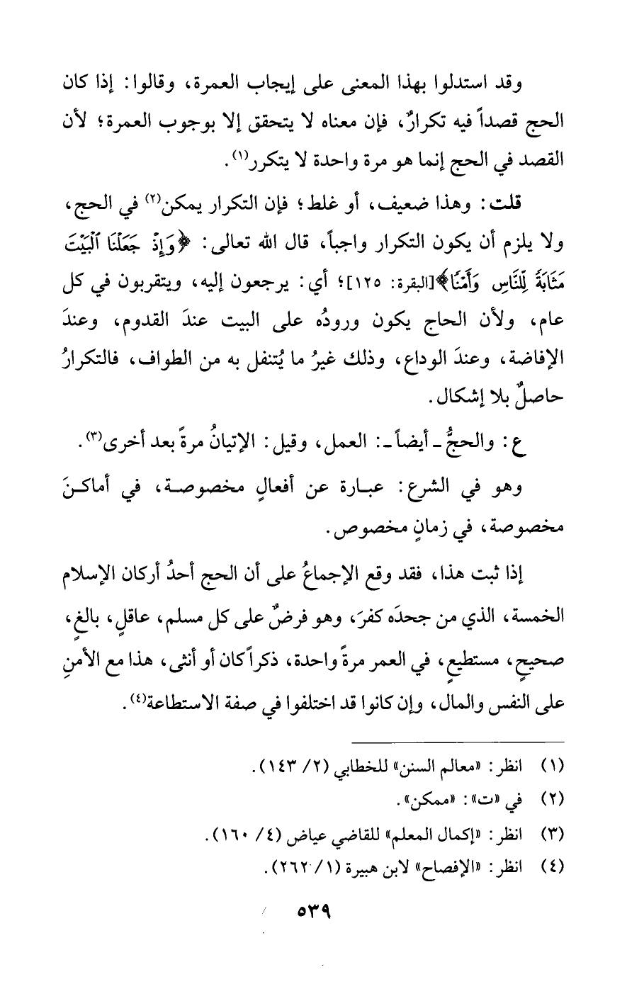 وقد استدلوا بهذا المعنى على إيجاب العمرة، وقالوا: إذا كان الحج قصدًا فيه تكرارٌ، فإن معناه لا يتحقق إلا بوجوب العمرة؛ لأن القصد في الحج إنما هو مرة واحدة لا يتكرر (¬1).