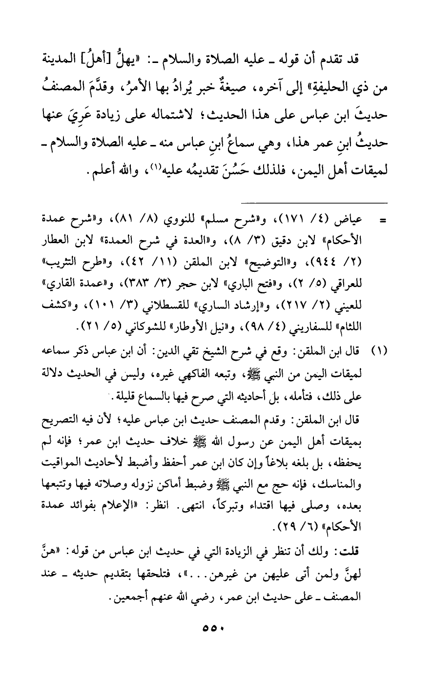 قلت: ولك أن تنظر في الزيادة التي في حديث ابن عباس من قوله: "هنَّ لهنَّ ولمن أتى عليهن من غيرهن. . . "، فتلحقها بتقديم حديثه -عند المصنف- على حديث ابن عمر، رضي اللَّه عنهم أجمعين.