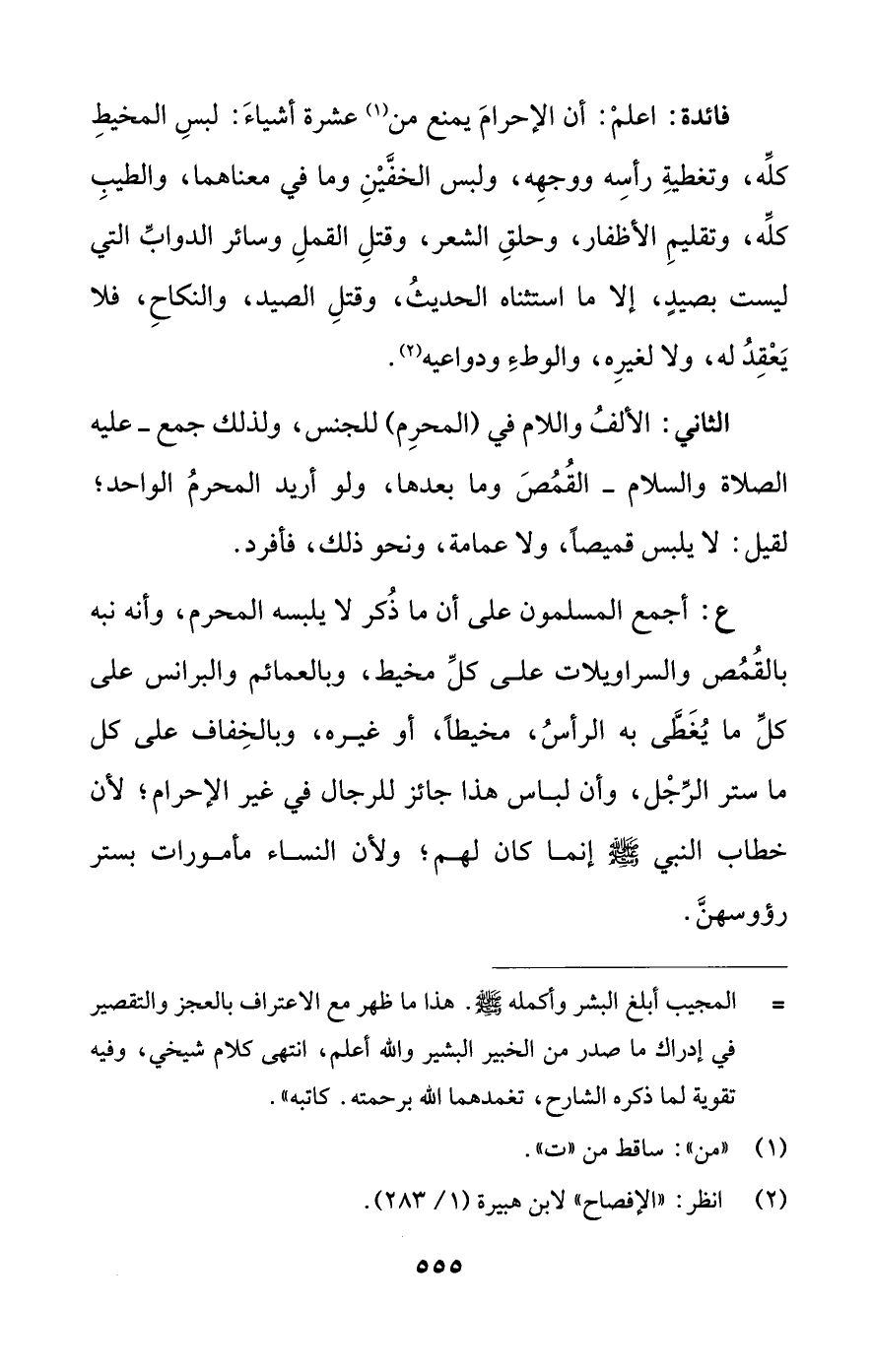 فائدة: اعلمْ: أن الإحرامَ يمنع من (¬1) عشرة أشياءَ: لبسِ المخيطِ كلِّه، وتغطيةِ رأسِه ووجهِه، ولبس الخفيْنِ وما في معناهما، والطيبِ كلِّه، وتقليمِ الأظفار، وحلقِ الشعر، وقتلِ القملِ وسائر الدوابِّ التي ليست بصيدٍ، إلا ما استثناه الحديثُ، وقتلِ الصيد، والنكاحِ، فلا يَعْقِدُ له، ولا لغيرِه، والوطءِ ودواعيه (¬2).