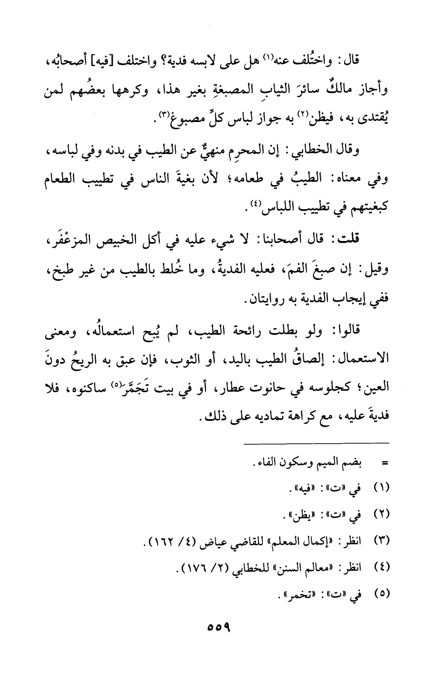 قال: واختُلف عنه (¬1) هل على لابسه فدية؟ واختلف [فيه] أصحابُه، وأجاز مالكٌ سائرَ الثيابِ المصبغةِ بغير هذا، وكرهها بعضُهم لمن يُقتدى به، فيظن (¬2) به جواز لباس كلِّ مصبوغ (¬3).