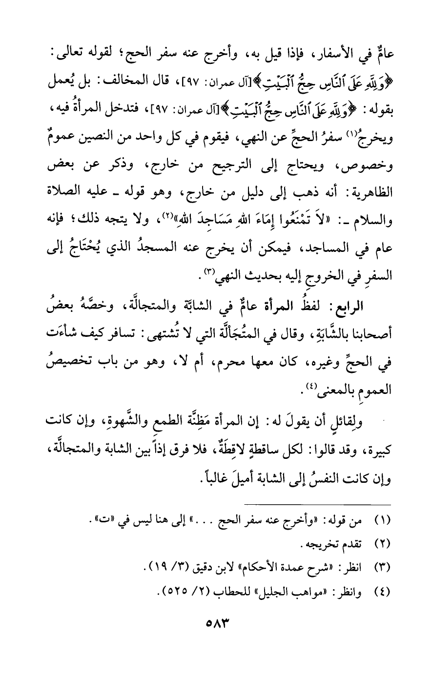 عامٌّ في الأسفار، فإذا قيل به، وأخرج عنه سفر الحج، لقوله تعالى: {وَلِلَّهِ عَلَى النَّاسِ حِجُّ الْبَيْتِ} [آل عمران: 97]، قال المخالف: بل يُعمل بقوله: {وَلِلَّهِ عَلَى النَّاسِ حِجُّ الْبَيْتِ} [آل عمران: 97]، فتدخل المرأةُ فيه، ويخرجُ (¬1) سفرُ الحجِّ عن النهي، فيقوم في كل واحد من النصين عمومٌ وخصوص، ويحتاج إلى الترجيح من خارج، وذكر عن بعض الظاهرية: أنه ذهب إلى دليل من خارج، وهو قوله -عليه الصلاة والسلام-: "لَا تَمْنَعُوا إِمَاءَ اللَّهِ مَسَاجِدَ اللَّهِ" (¬2)، ولا يتجه ذلك؛ فإنه عام في المساجد، فيمكن أن يخرج عنه المسجدُ الذي يُحْتَاجُ إلى السفرِ في الخروجِ إليه بحديث النهي (¬3).