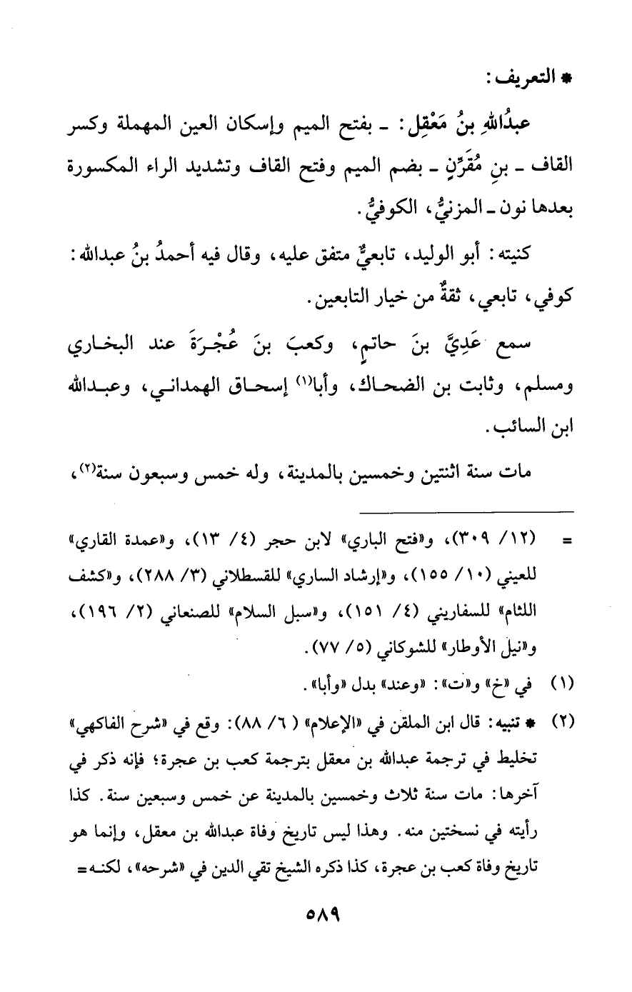 (¬2) * تنبيه: قال ابن الملقن في "الإعلام" (6/ 88): وقع في "شرح الفاكهي" تخليط في ترجمة عبد اللَّه بنْ معقل بترجمة كعب بن عجرة؛ فإنه ذكر في آخرها: مات سنة ثلاث وخمسين بالمدينة عن خمس وسبعين سنة. كذا رأيته في نسختين منه. وهذا ليس تاريخ وفاة عبد اللَّه بن معقل، وإنما هو تاريخ وفاة كعب بن عجرة، كذا ذكره الشيخ تقي الدين في "شرحه"، لكنه =