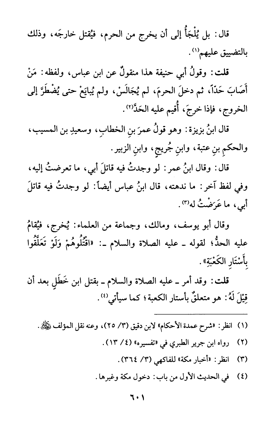 قلت: وقولُ أبي حنيفة هذا منقولٌ عن ابن عباس، ولفظه: مَنْ أَصَابَ حَدًّا، ثم دخلَ الحرمَ، لم يُجَالَسْ، ولم يُبايَعْ حتى يُضْطَرَّ إلى الخروج، فإذا خرجَ، أُقيم عليه الحَدَّ (¬2).