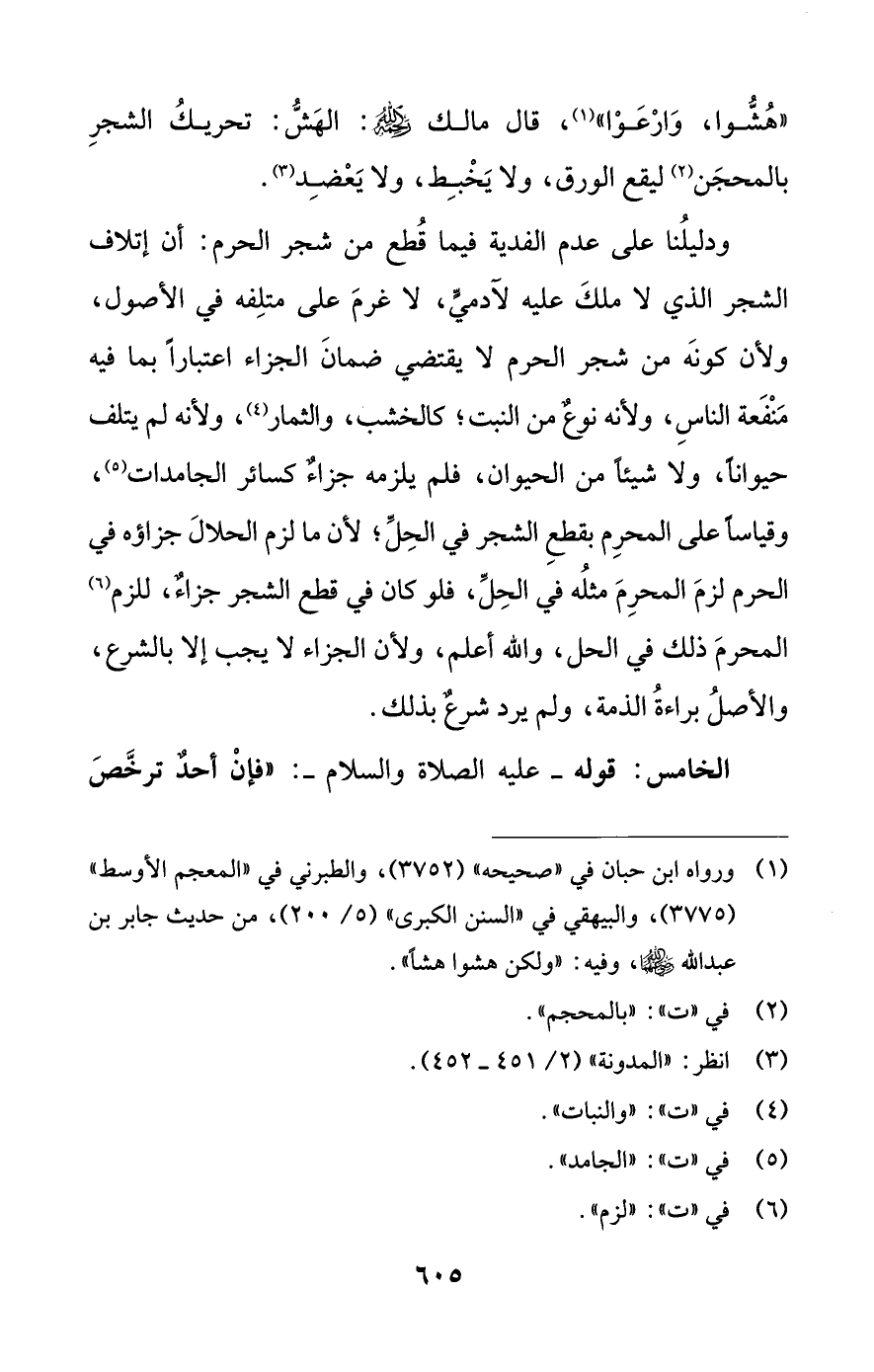 ودليلُنا على عدم الفدية فيما قُطع من شجر الحرم: أن إتلاف الشجر الذي لا ملكَ عليه لآدميٍّ، لا غرمَ على متلِفه في الأصول، ولأن كونَه من شجر الحرم لا يقتضي ضمانَ الجزاء اعتبارًا بما فيه مَنْفَعة الناسِ، ولأنه نوعٌ من النبت؛ كالخشب، والثمار (¬4)، ولأنه لم يتلف حيوانًا، ولا شيئًا من الحيوان، فلم يلزمه جزاءٌ كسائر الجامدات (¬5)، وقياسًا على المحرِم بقطعِ الشجر في الحِلِّ، لأن ما لزم الحلالَ جزاؤه في الحرم لزمَ المحرِمَ مثلُه في الحِلِّ، فلو كان في قطع الشجر جزاءٌ، للزم (¬6) المحرمَ ذلك في الحل، واللَّه أعلم، ولأن الجزاء لا يجب إلا بالشرع، والأصلُ براءةُ الذمة، ولم يرد شرعٌ بذلك.