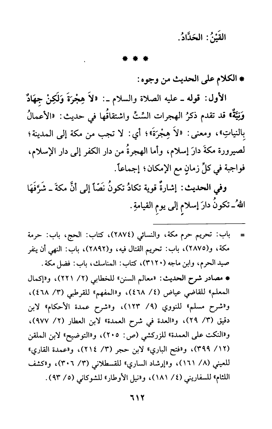 الأول: قوله -عليه الصلاة والسلام-: "لَا هِجْرَةَ وَلَكِنْ جِهَادٌ وَنِيَّةٌ"، قد تقدم ذكرُ الهجرات السِّتّ واشتقاقُها في حديث: "الأعمالُ بِالنياتِ"، ومعنى: "لَا هِجْرَةَ"؛ أي: لا تجب من مكة إلى المدينة؛ لصيرورة مكةَ دارَ إسلام، وأما الهجرةُ من دار الكفر إلى دار الإسلام، فواجبة في كلِّ زمانٍ مع الإمكان؛ إجماعًا.