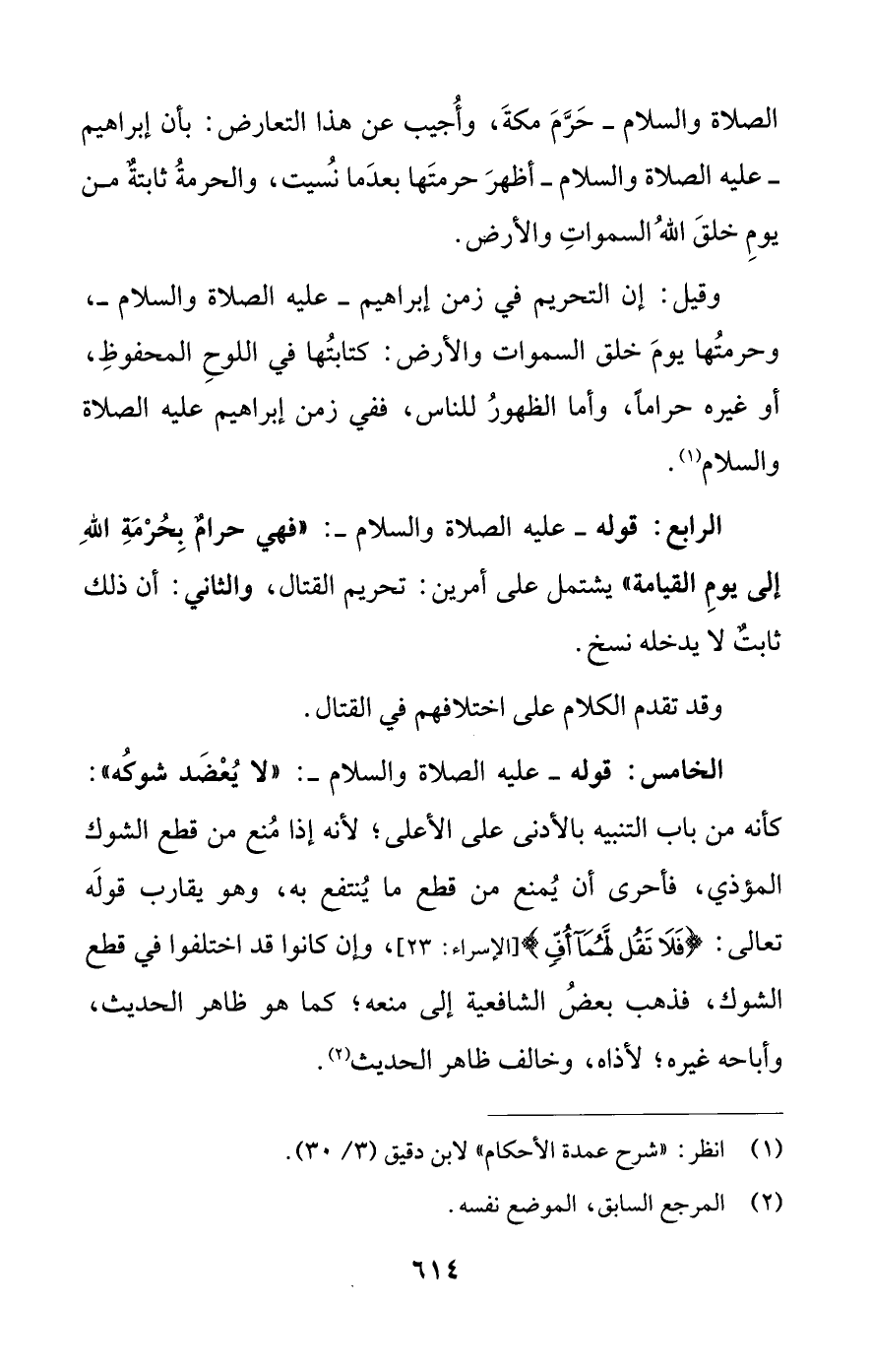 الخامس: قوله -عليه الصلاة والسلام-: "لا يُعْضَد شوكُه": كأنه من باب التنبيه بالأدنى على الأعلى، لأنه إذا مُنع من قطع الشوك المؤذي، فأحرى أن يُمنع من قطع ما يُنتفع به، وهو يقارب قولَه تعالى: {فَلَا تَقُلْ لَهُمَا أُفٍّ وَلَا} [الإسراء: 23]، وإن كانوا قد اختلفوا في قطع الشوك، فذهب بعضُ الشافعية إلى منعه، كما هو ظاهر الحديث، وأباحه غيره، لأذاه، وخالف ظاهر الحديث (¬2).