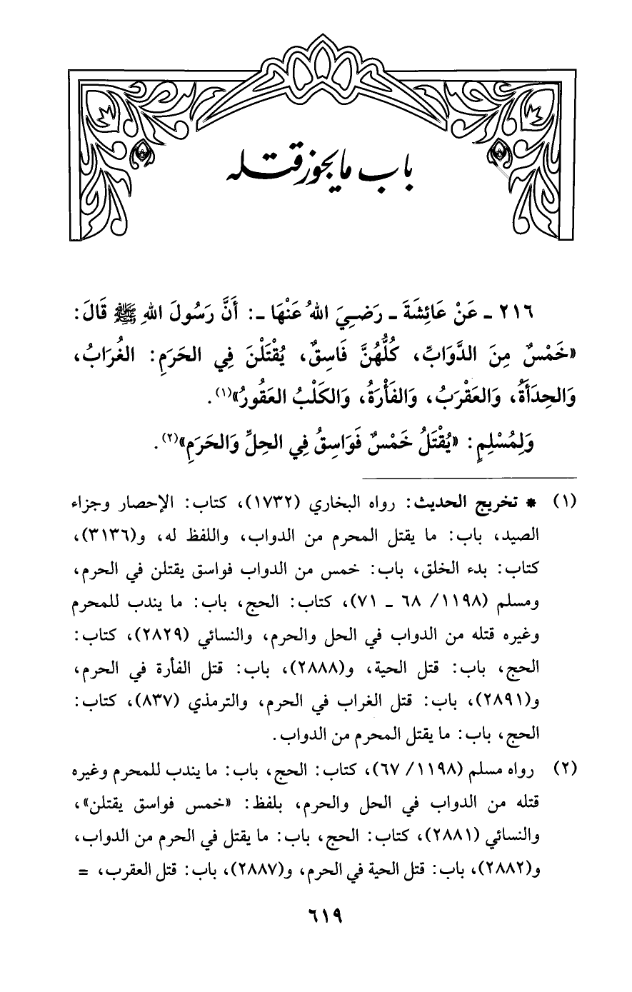 216 - عَنْ عَائِشَةَ -رضي اللَّه عنها-: أَنَّ رَسُولَ اللَّهِ -صلى اللَّه عليه وسلم- قَالَ: "خَمْسٌ مِنَ الدَّوَابِّ، كلُّهُنَّ فَاسِقٌ، يُقْتَلْنَ فِي الحَرَمِ: الغُرَابُ، وَالحِدَأة، وَالعَقْرَبُ، وَالفَأْرَةُ، وَالكَلْبُ العَقُورُ" (¬1).