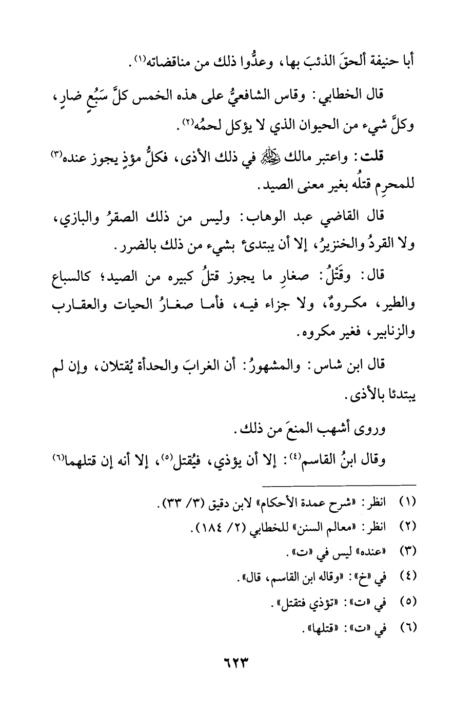قال الخطابي: وقاس الشافعيُّ على هذه الخمس كلَّ سَبُعٍ ضارٍ، وكلَّ شيء من الحيوان الذي لا يؤكل لحمُه (¬2).