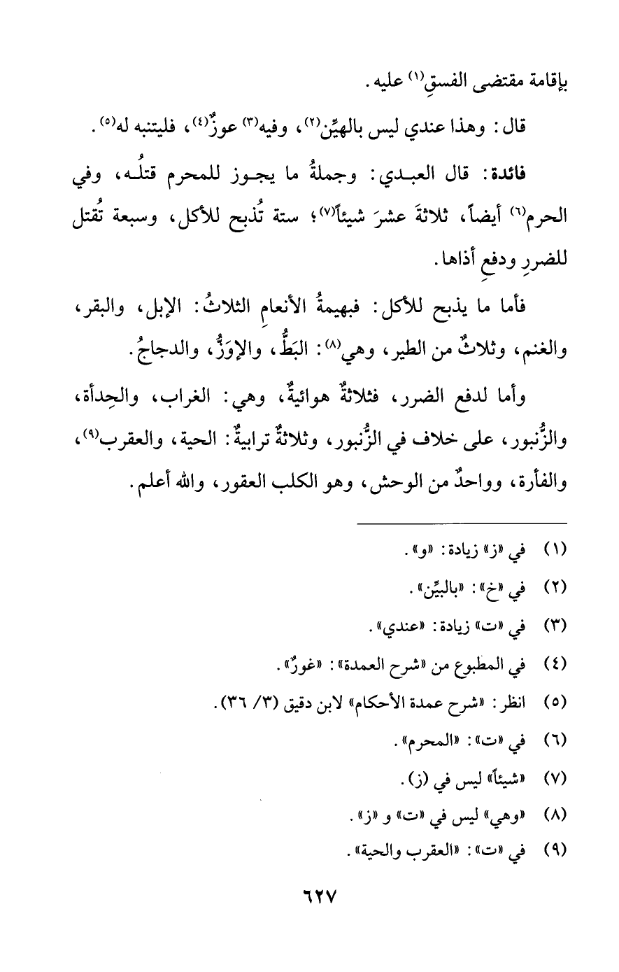 فائدة: قال العبدي: وجملةُ ما يجوز للمحرم قتلُه، وفي الحرم (¬6) أيضًا، ثلاثةَ عشرَ شيئًا (¬7)؛ ستة تُذبح للأكل، وسبعة تُقتل للضررِ ودفعِ أذاها.