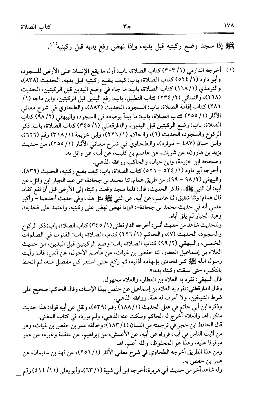 صلى الله عليه وسلم إذا سجد وضع ركبتيه قبل يديه، وإذا نهض رفع يديه قبل ركبتيه.