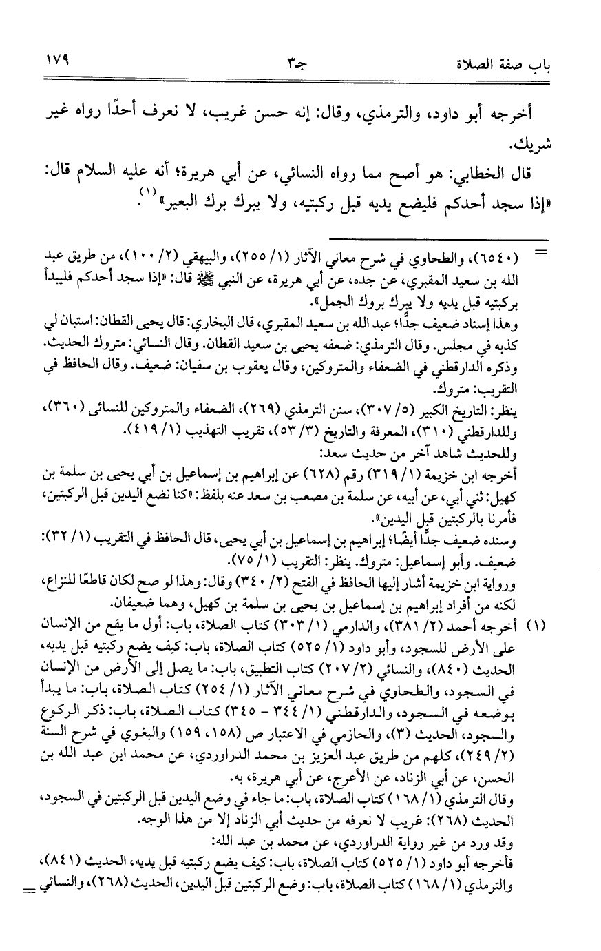 قال الخطابي: هو أصح مما رواه النسائي، عن أبي هريرة؛ انه عليه السلام قال: "إذا سجد أحدكم فليضع يديه قبل ركبتيه، ولا يبرك برك البعير".