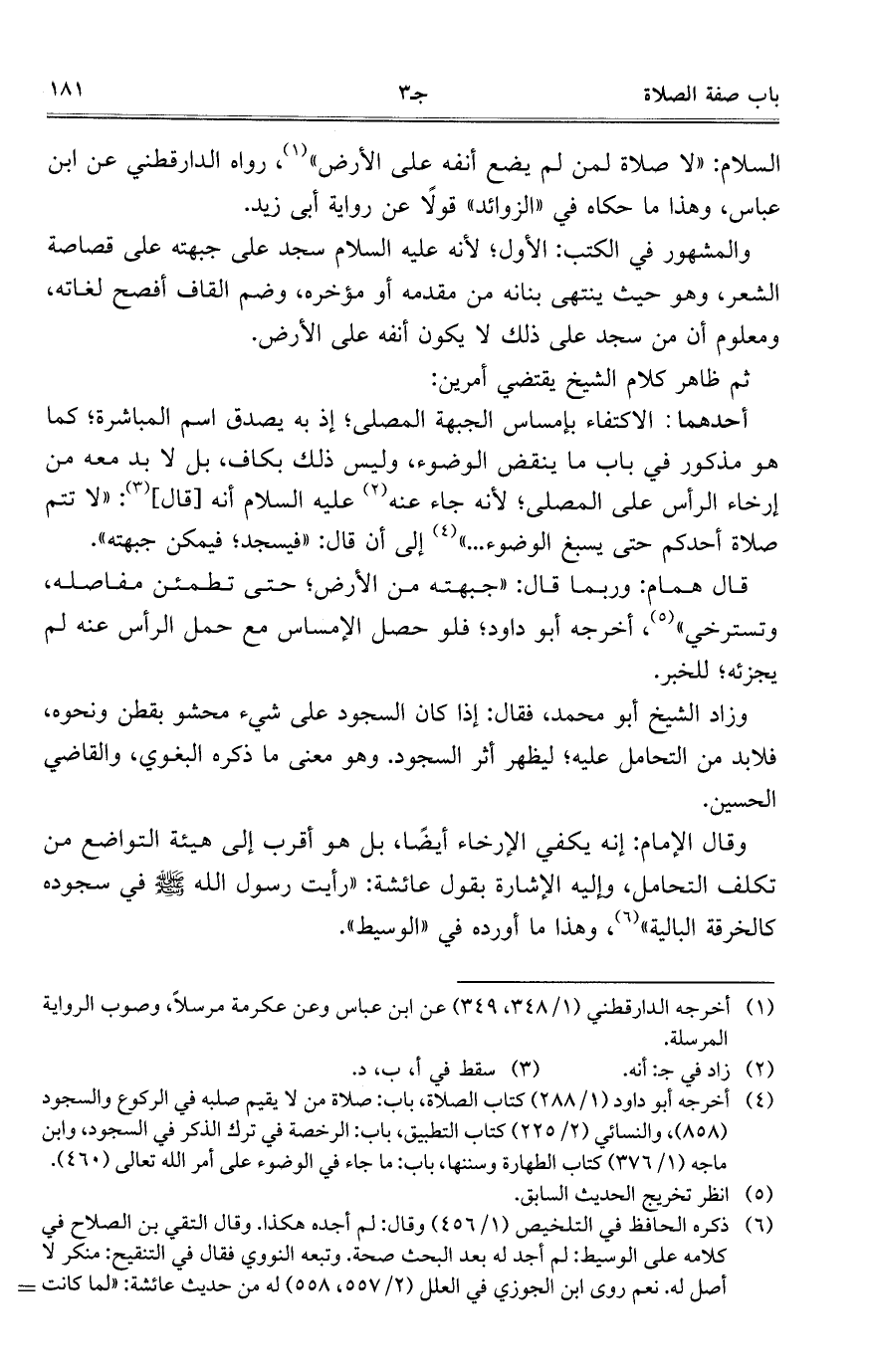 السلام: "لا صلاة لمن لم يضع أنفه على الأرض"، رواه الدارقطني عن ابن عباس، وهذا ما حكاه في "الزوائد" قولاً عن رواية أبي زيد.