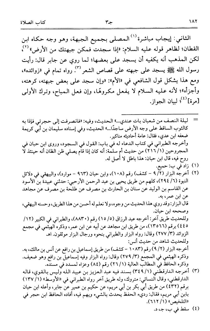 الثاني: إيجاب مباشرة المصلى بجميع الجبهة، وهو وجه حكاه ابن القطان؛ لظاهر قوله عليه السلام: "إذا سجدت فمكن جبهتك من الأرض"، لكن المذهب أنه يكفيه أن يسجد على بعضها؛ لما روي عن جابر قال: رأيت رسول الله صلى الله عليه وسلم يسجد على جبهته على قصاص الشعر. رواه تمام في "زوائده"، ومع هذا يشكل قول الشافعي في "الأم": "وإن سجد على بعض جبهته، كرهته، وأجزأه"؛ لأنه عليه السلام لا يفعل مكروهاً، وإن فعل المباح، وترك الأولى [مرة]؛ لبيان الجواز.