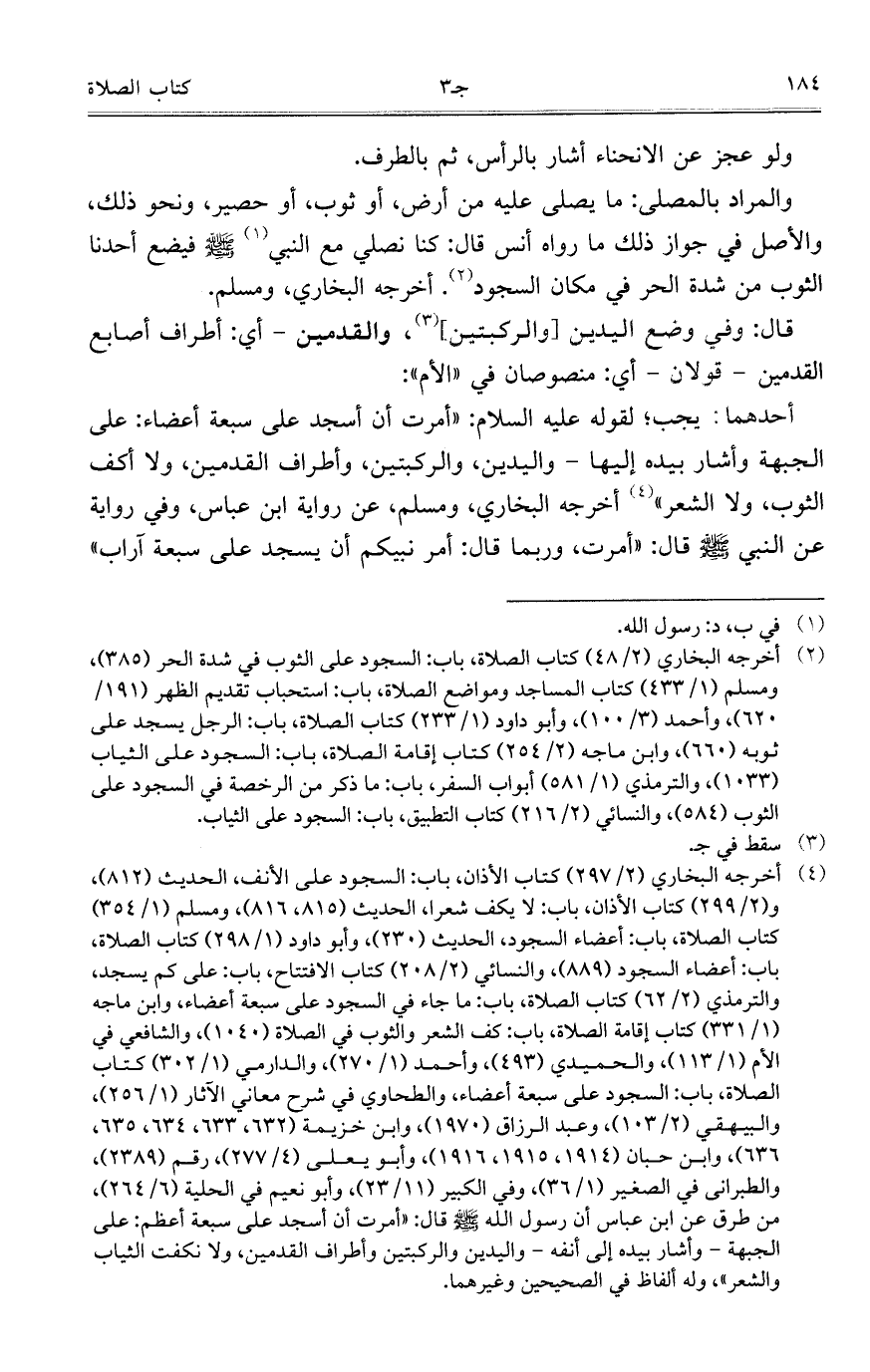 أحدهما: يجب؛ لقوله عليه السلام:"أمرت أن أسجد على سبعة أعضاء: على الجبهة وأشار بيده إليها- واليدين، والركبتين، وأطراف القدمين، ولا أكف الثوب، ولا الشعر" أخرجه البخاري، ومسلم، عن رواية ابن عباس، وفي رواية عن النبي صلى الله عليه وسلم قال: "أمرت، وربما قال: أمر نبيكم أن يسجد على سبعة آراب"