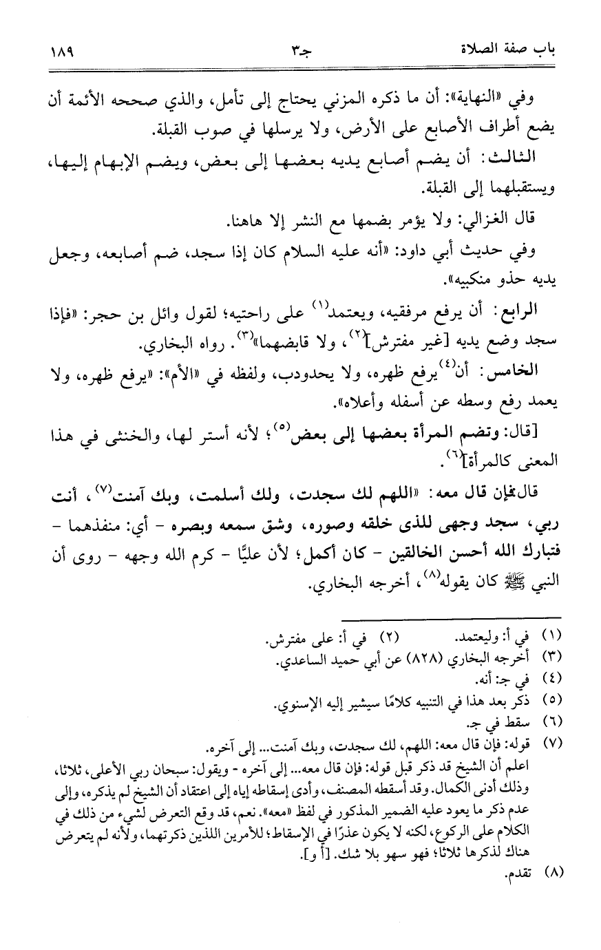 الرابع: أن يرفع مرفقيه، ويعتمد على راحتيه؛ لقول وائل بن حجر: "فإذا سجد وضع يديه [غير مفترش]، ولا قابضهما". رواه البخاري.