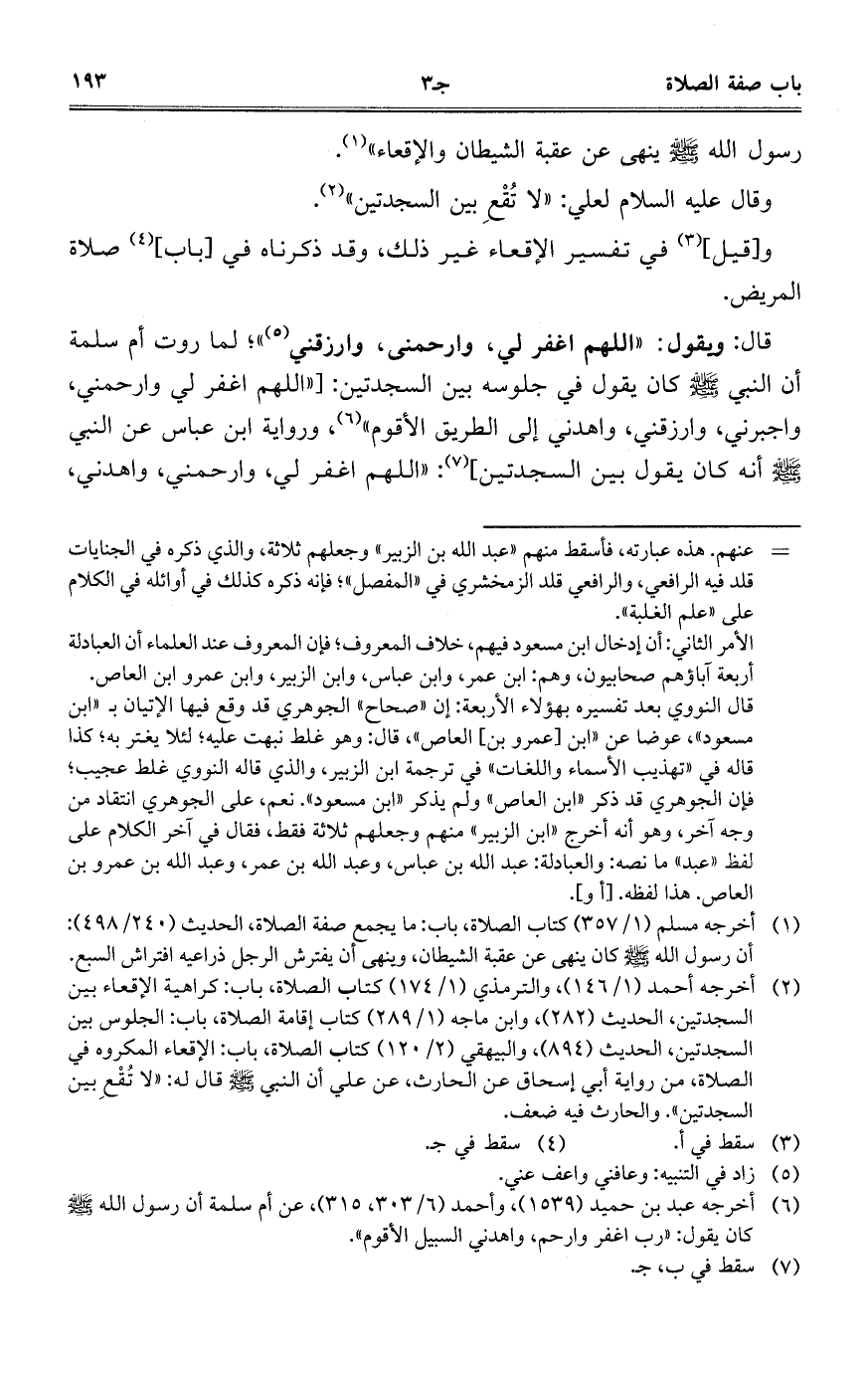 قال: ويقول: "اللهم اغفر لي، وارحمني، وارزقني"؛ لماروت أم سلمة أن النبي صلى الله عليه وسلم كان يقول في جلوسه بين السجدتين: ["اللهم اغفر لي وارحمني، واجبرني، وارزقني، واهدني إلى الطريق الأقوم"، ورواية ابن عباس عن النبي صلى الله عليه وسلم أنه كان يقول بين السجدتين]: "اللهم اغفر لي، وارحمني، واهدني،