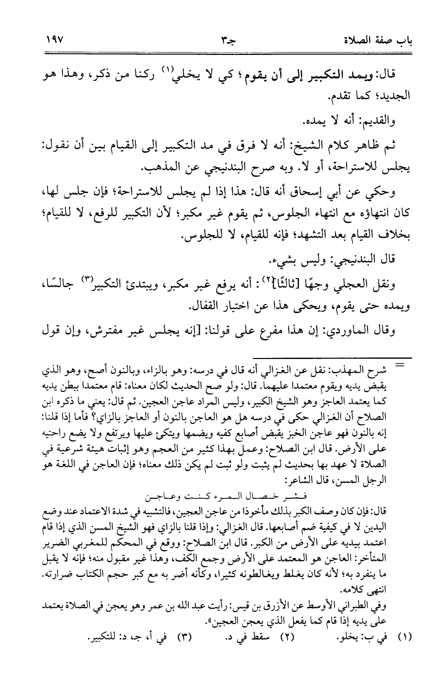 ثم ظاهر كلام الشيخ: أنه لا فرق في مد التكبير إلى القيام بين أن نقول: يجلس للاستراحة، أو لا. وبه صرح البندنيجي عن المذهب.