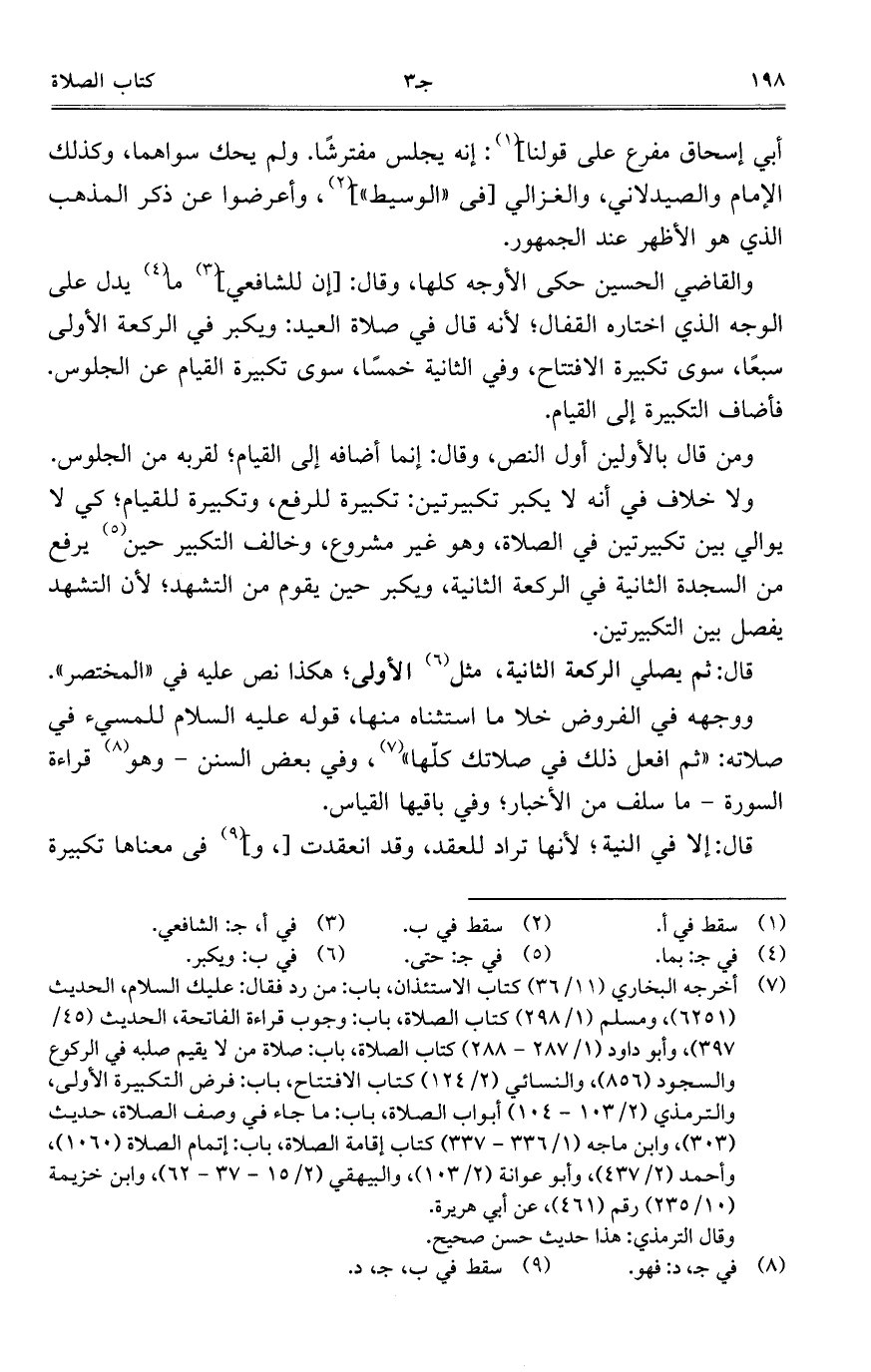 والقاضي الحسين حكى الأوجه كلها، وقال: [إن للشافعي] ما يدل على الوجه الذي اختاره القفال؛ لأنه قال في صلاة العيد: ويكبر في الركعة الأولى سبعاً، سوى تكبيرة الافتتاح، وفي الثانية خمساً، سوى تكبيرة القيام عن الجلوس. فأضاف التكبيرة إلى القيام.