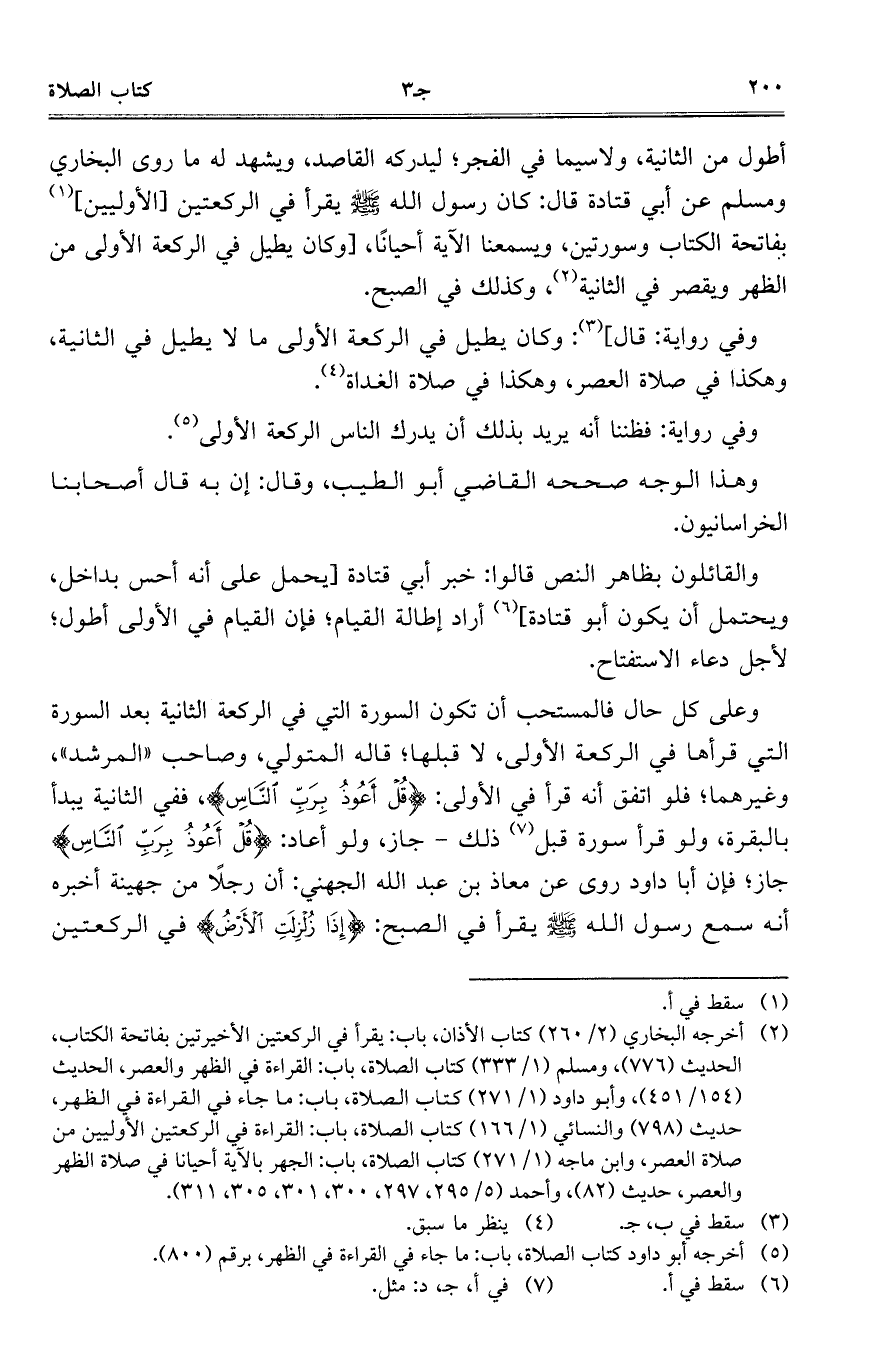 أطول من الثانية، ولا سيما في الفجر؛ ليدركه القاصد، ويشهد له ما روى البخاري ومسلم عن أبي قتادة قال: كان رسول الله صلى الله عليه وسلم يقرأ في الركعتين [الأوليين] بفاتحة الكتاب وسورتين، ويسمعنا الآية أحياناً، [وكان يطيل في الركعة الأولى من الظهر ويقصر في الثانية، وكذلك في الصبح.