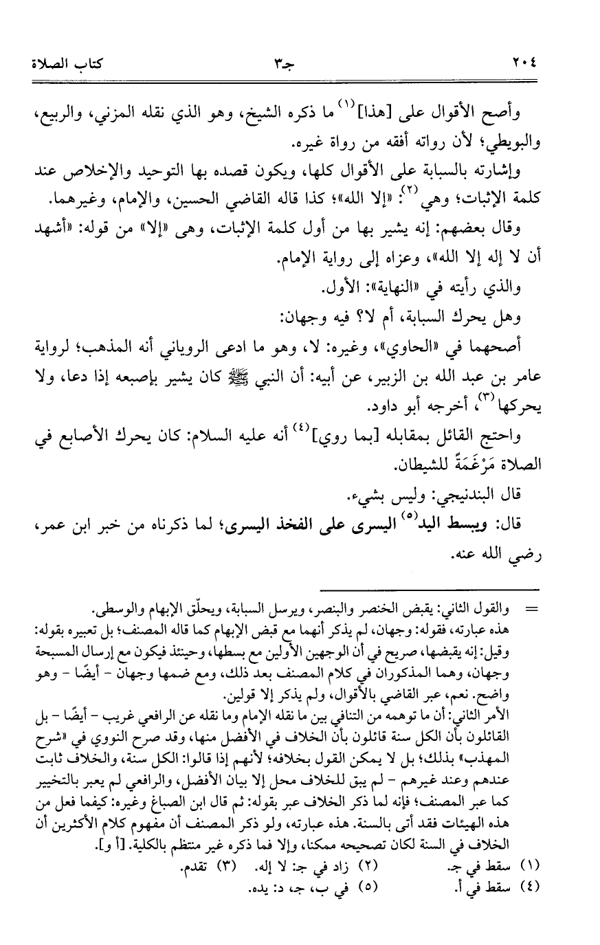 وقال بعضهم: إنه يشير بها من أول كلمة الإثبات، وهي "إلا" من قوله: "أشهد أن لا إله إلا الله"، وعزاه إلى رواية الإمام.