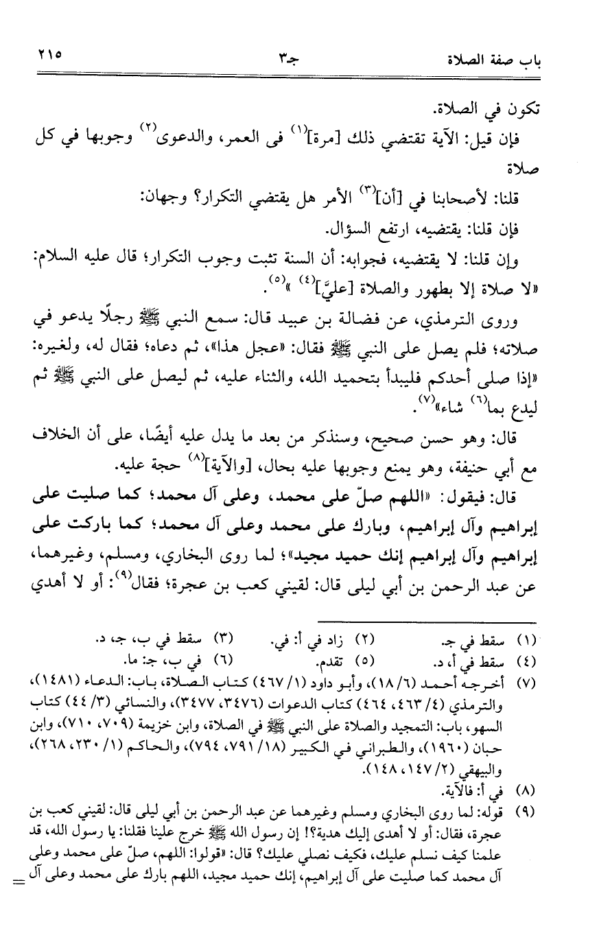 قال: فيقول: "اللهم صل على محمد، وعلى آل محمد؛ كما صليت على إبراهيم وآل إبراهيم، وبارك على محمد وعلى آل محمد؛ كما باركت على إبراهيم وآل إبراهيم إنك حميد مجيد"؛ لما روى البخاري، ومسلم، وغيرهما، عن عبد الرحمن بن أبي ليلى قال: لقيني كعب بن عجرة؛ فقال: أو لا أهدي.
