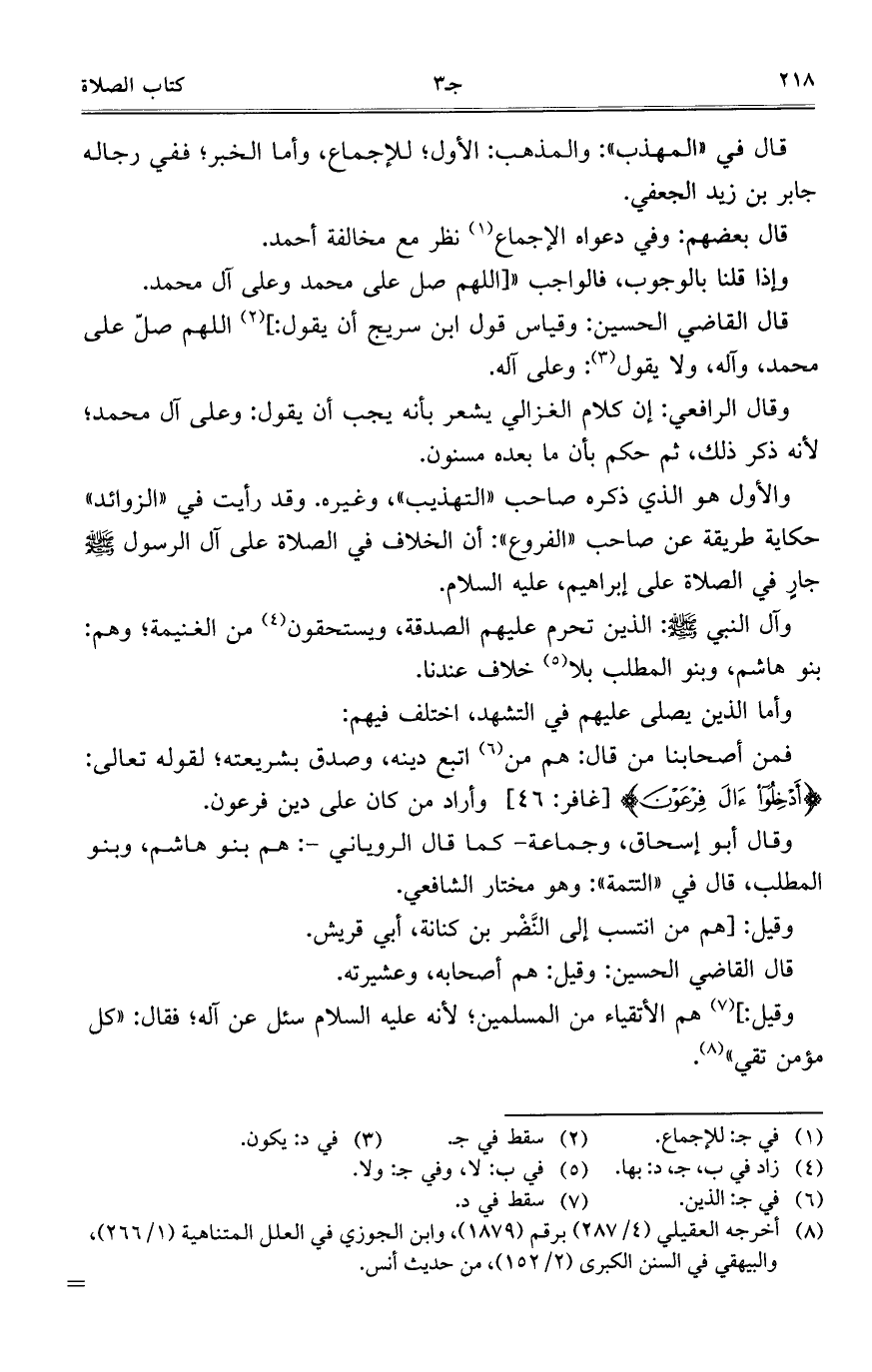 وآل النبي صلى الله عليه وسلم: الذين تحرم عليهم الصدقة، ويستحقون من الغنيمة؛ وهم: بنو هاشم، وبنو المطلب بلا خلاف عندنا.