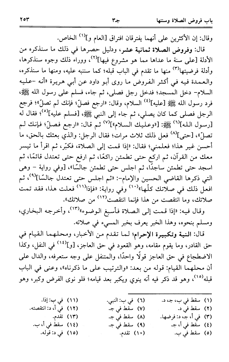 قال: وفروض الصلاة ثمانية عشر، ودليل حصرها في ذلك ما سنذكره من الأدلة [على سنة ما عداها مما هو مشروع فيها]، ووراء ذلك وجوه سنذكرها، وأدلة فرضيتها منها ما تقدم في الباب قبله؛ كما سننبه عليه، ومنها ما سنذكره، والعمدة فيه في أكثر الفروض ما روى أبو داود عن أبي هريرة "أنه -عليه السلام- دخل المسجد؛ فدخل رجل فصلى، ثم جاء، فسلم على رسول الله صلى الله عليه وسلم، فرد رسول الله صلى الله عليه وسلم [عليه] السلام، وقال: "ارجع فصلّ؛ فإنك لم تصلّ"؛ فرجع الرجل فصلى كما كان يصلي، ثم جاء إلى النبي صلى الله عليه وسلم، [فسلم عليه]؛ فقال له [رسول الله] صلى الله عليه وسلم: ["وعليك السلام"] ثم قال:"ارجع فصلّ؛ فإنك لم تصلّ"، [حتى] فل ذلك ثلاث مرات؛ فقال الرجل: والذي بعثك بالحق، ما أحسن غير هذا؛ فعلمني؛ فقال: "إذا قمت إلى الصلاة، فكبّر، ثم اقرأ ما تيسر معك من القرآن ثم اركع حتى تطمئن راكعاً، ثم ارفع حتى تعتدل قائماً، ثم اسجد حتى تطمئن ساجداً، ثم اجلس حتى تطمئن جالساً"، [وفي رواية-وهي التي ذكرها القاضي الحسين والإمام-: "ثم اجلس حتى تعتدل جالساً]، ثم افعل ذلك في صلاتك كلها" وفي رواية: "فإذا فعلت هذا، فقد تمت صلاتك، وما انتقصت من هذا فإنما انتقصت من صلاتك".