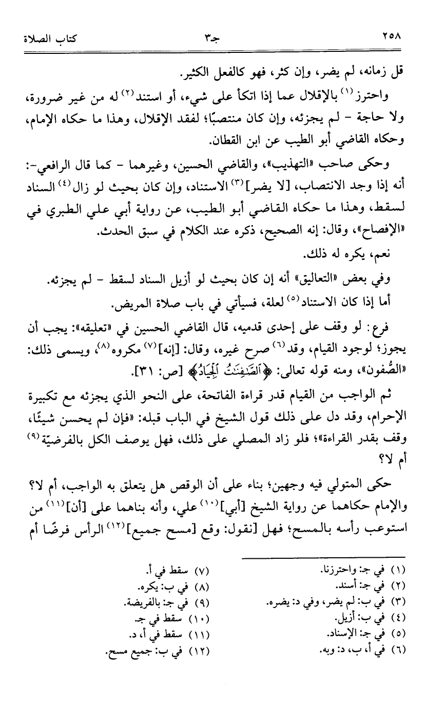 واحترز بالإقلال عما إذا اتكأ على شيء، أو استند له من غير ضرورة، ولا حاجة- لم يجزئه، وإن كان منتصباً؛ لفقد الإقلال، وهذا ما حكاه الإمام، وحكاه القاضي أبو الطيب عن ابن القطان.