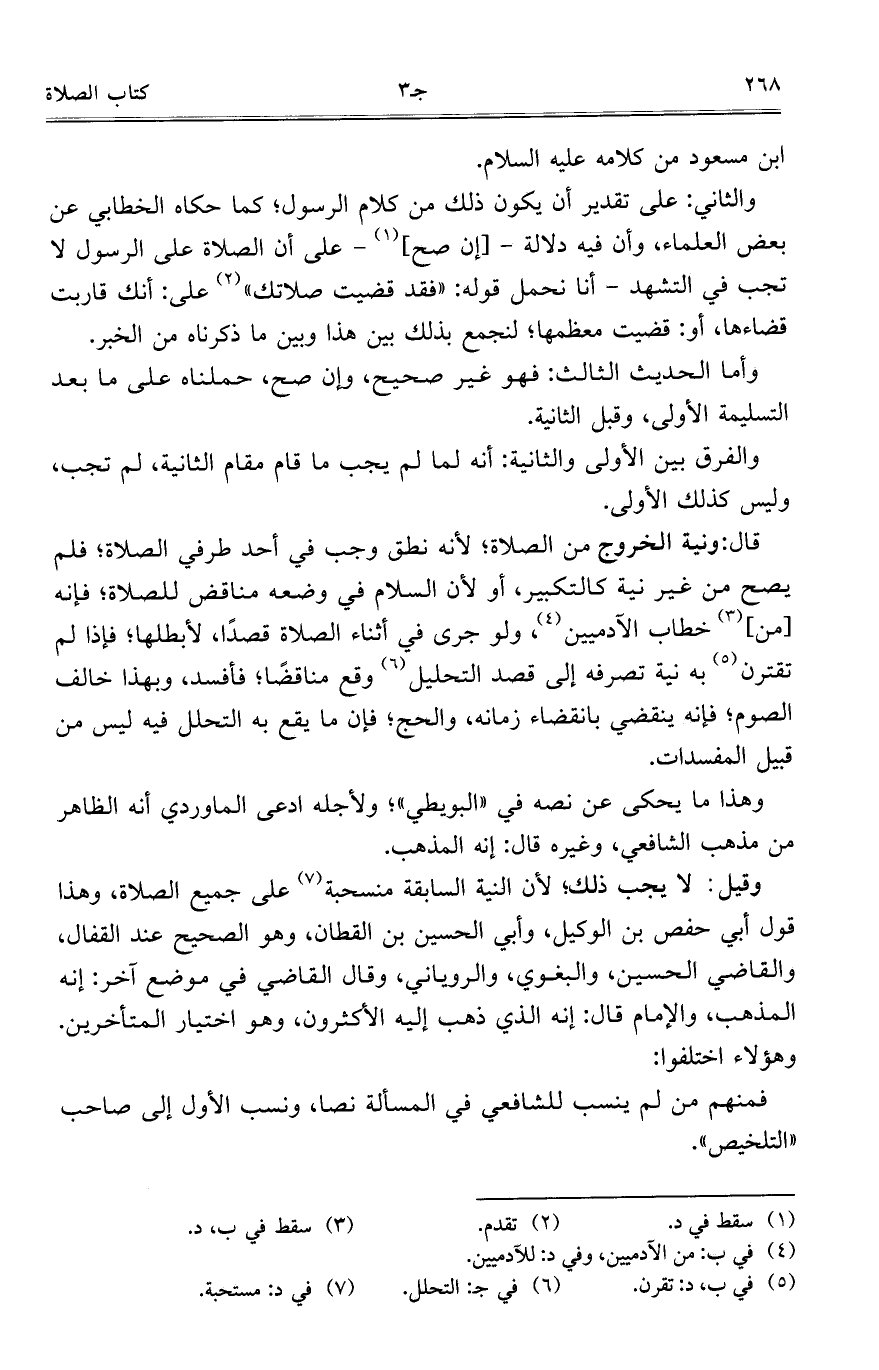 قال: ونية الخروج من الصلاة؛ لأنه نطق وجب في أحد طرفي الصلاة؛ فلم يصح من غير نية كالتكبير، أو لأن السلام في وضعه مناقض للصلاة؛ فإنه [من] خطاب الآدميين، ولو جرى في أثناء الصلاة قصداً، لأبطلها؛ فإذا لم تقترن به نية تصرفه إلى قصد التحليل وقع مناقضاً؛ فأفسد، وبهذا خالف الصوم؛ فإنه ينقضي بانقضاء زمانه، والحج؛ فإن ما يقع به التحلل فيه ليس من قبيل المفسدات.