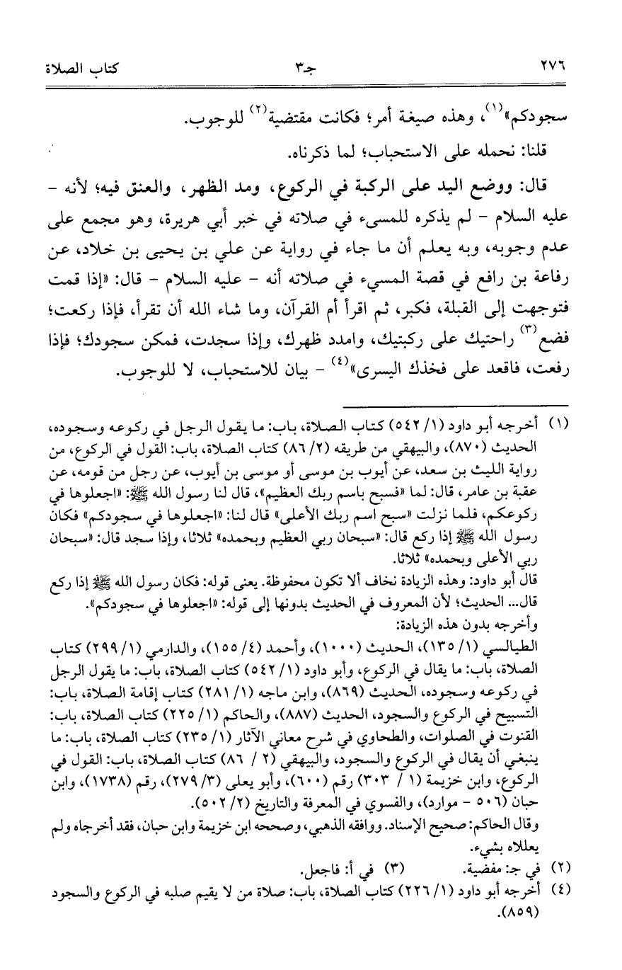 قال: ووضع اليد على الركبة في الركوع، ومد الظهر، والعنق فيه؛ لأنه -عليه السلام- لم يذكره للمسيء في صلاته في خبر أبي هريرة، وهو مجمع على عدم وجوبه، وبه يعلم أن ما جاء في رواية عن علي بن يحيى بن خلاد، عن رفاعة بن رافع في قصة المسيء في صلاته أنه -عليه السلام- قال: "إذا قمت فتوجهت إلى القبلة، فكبر، ثم اقرأ أم القرآن، وما شاء الله أن تقرأ، فإذا ركعت؛ فضع راحتيك على ركبتيك، وامدد ظهرك، وإذا سجدت، فمكن سجودك؛ فإذا رفعت، فاقعد على فخذك اليسرى"-بيان للاستحباب، لا للوجوب.
