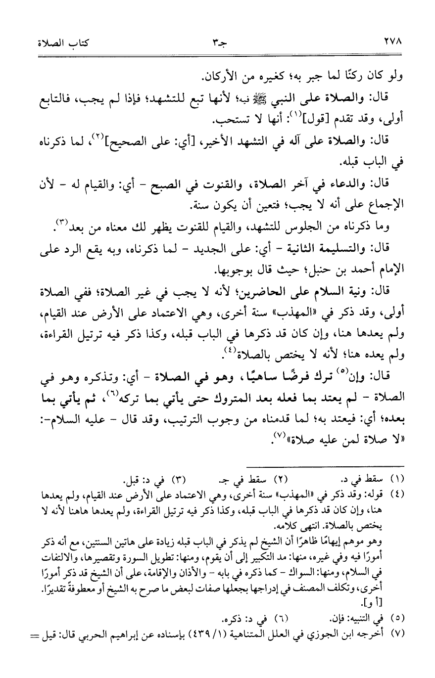 قال: والصلاة على النبي صلى الله عليه وسلم فيه؛ لأنها تبع للتشهد؛ فإذا لم يجب، فالتابع أولى، وقد تقدم [قول]: أنها لا تستحب.